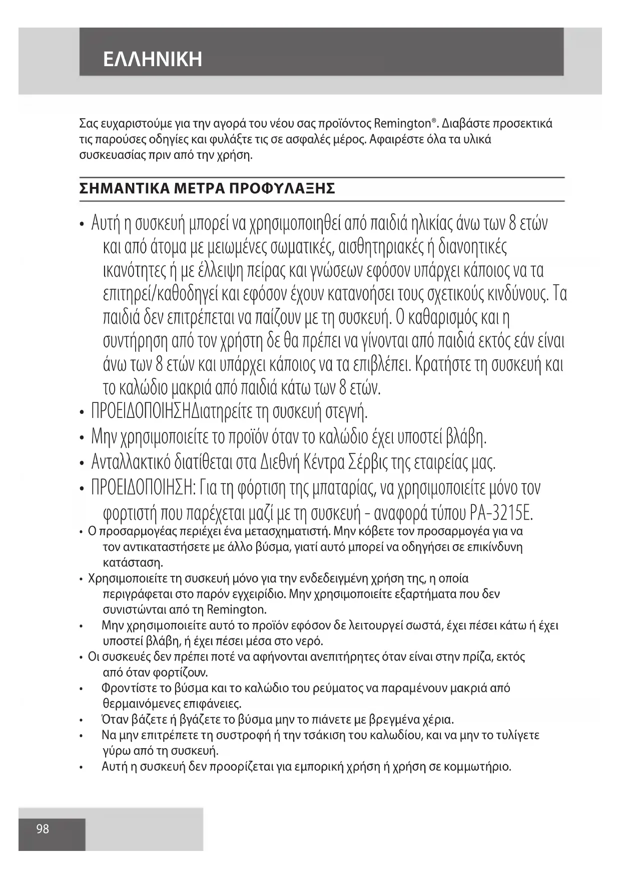 AE98 Σας ευχαριστούμε για την αγορά του νέου σας προϊόντος Remington®. Διαβάστε προσεκτικά τις παρούσες οδηγίες και φυλάξτε τις σε ασφαλές μέρος. Αφαιρέστε όλα τα υλικά συσκευασίας πριν από την χρήση. ΣΗΜΑΝΤΙΚΑ ΜΕΤΡΑ ΠΡΟΦΥΛΑΞΗΣ