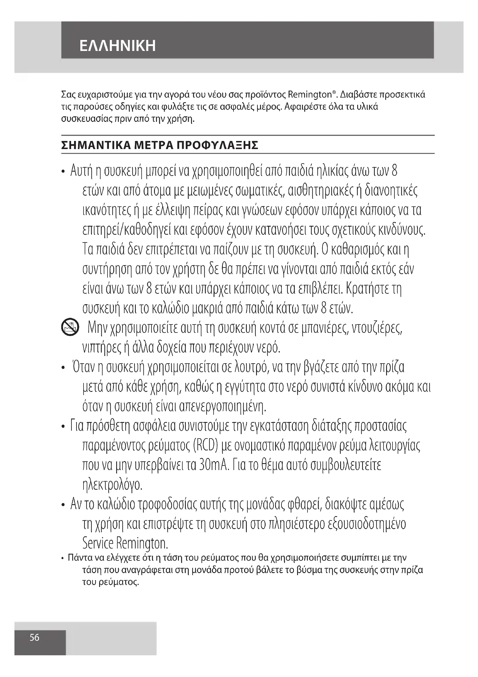 AE56 Σας ευχαριστούμε για την αγορά του νέου σας προϊόντος Remington®. Διαβάστε προσεκτικά τις παρούσες οδηγίες και φυλάξτε τις σε ασφαλές μέρος. Αφαιρέστε όλα τα υλικά συσκευασίας πριν από την χρήση. ΣΗΜΑΝΤΙΚΑ ΜΕΤΡΑ ΠΡΟΦΥΛΑΞΗΣ