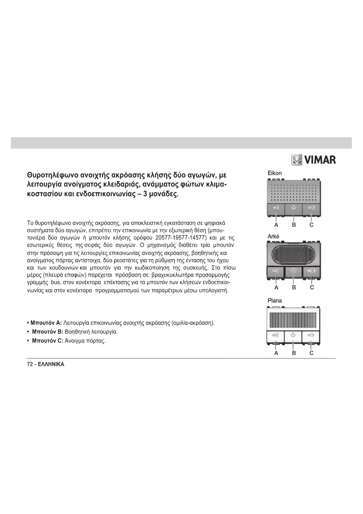 - Μπουτόν C: Άνοιγμα πόρτας Θυροτηλέφωνο ανοιχτής ακρόασης κλήσης δύο αγωγών, με λειτουργία ανοίγματος κλειδαριάς, ανάμματος φώτων κλιμα- κοστασίου και ενδοεπικοινωνίας – 3 μονάδες. Eikon Plana B CA B CA Arké