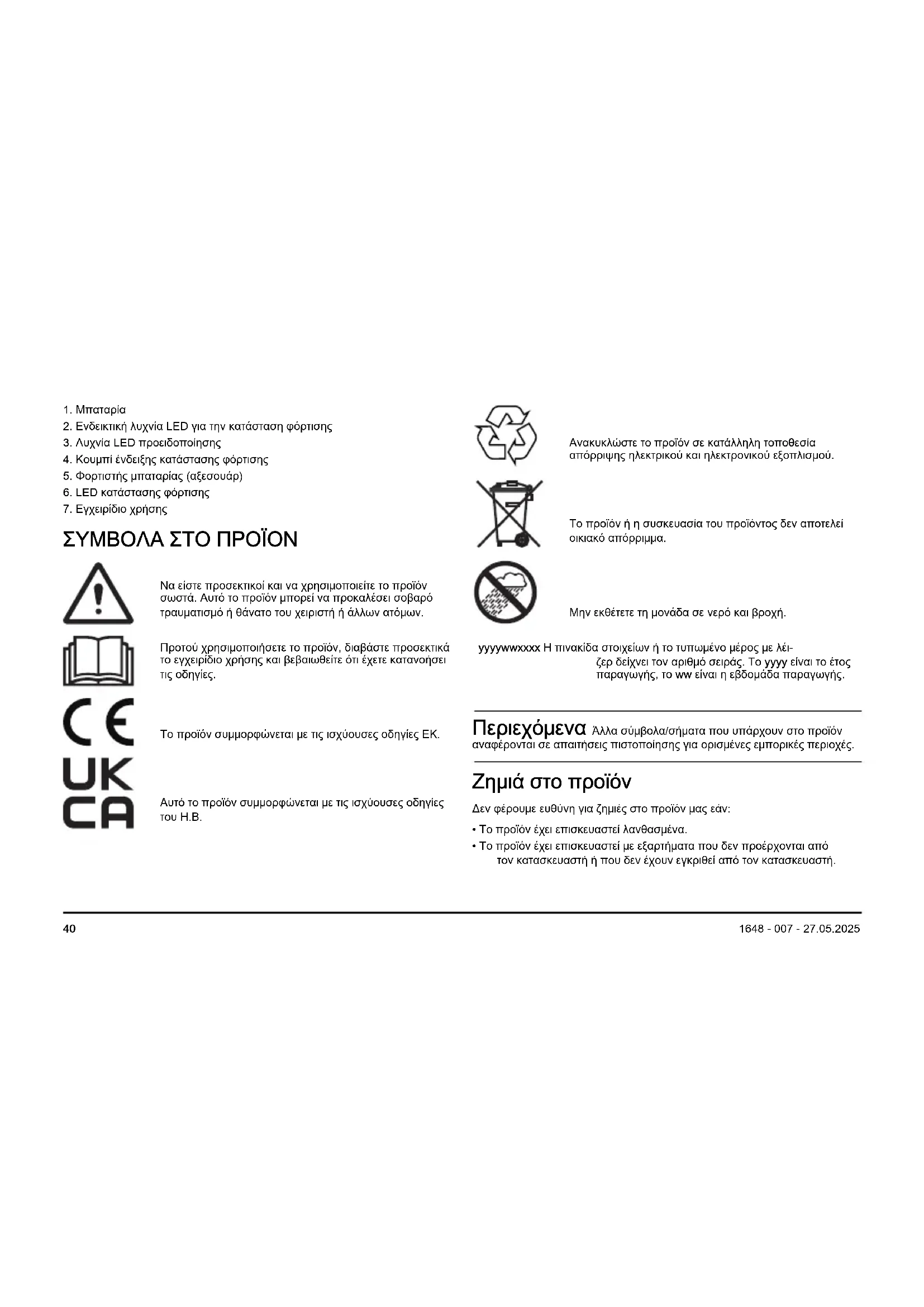 1648 - 007 - 27.05.2025• Φορτίστε την μπαταρία κατά 30% έως 50% προτού την αποθηκεύσετε για μεγάλο χρονικό διάστημα.