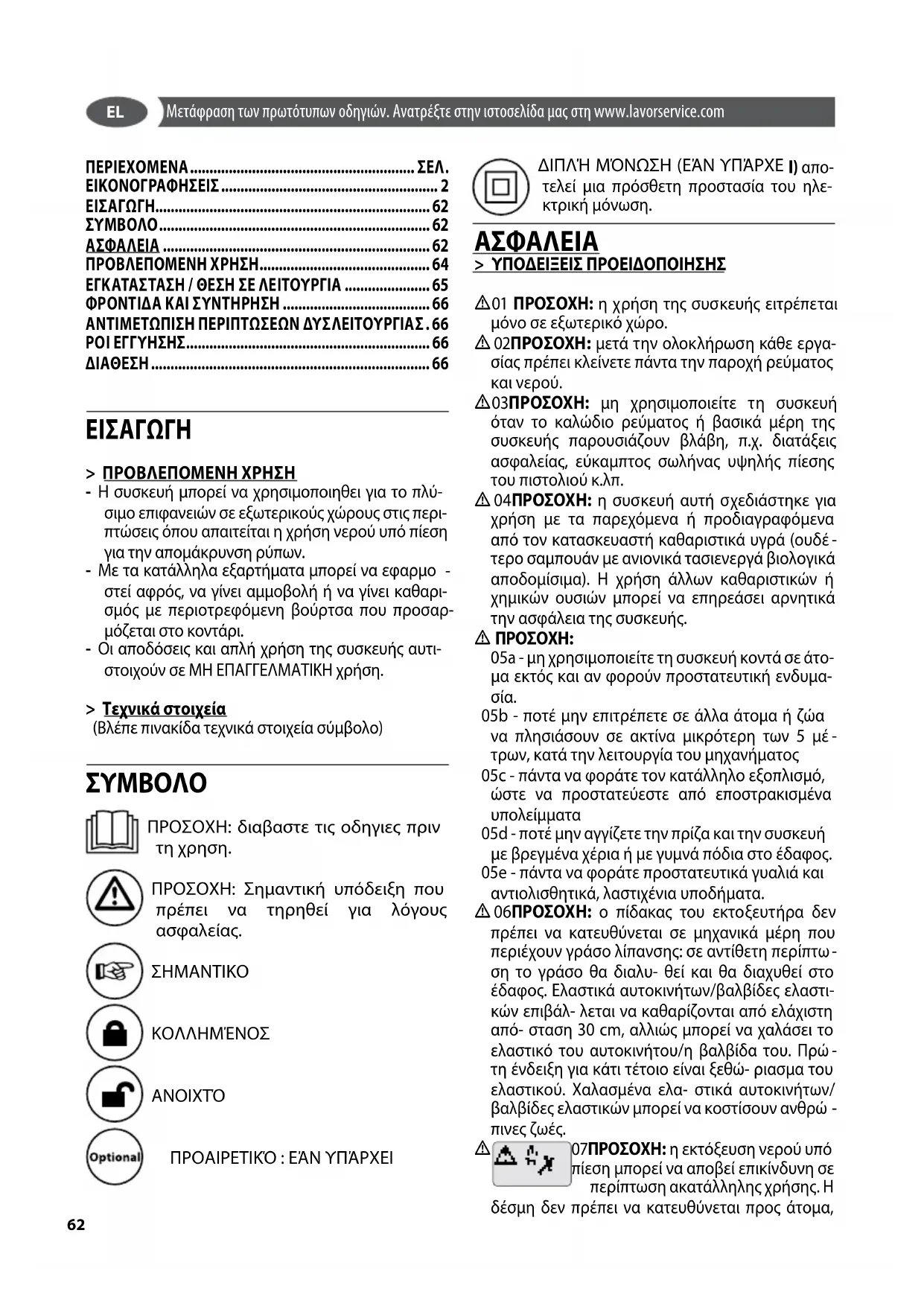 07ΠΡΟΣΟΧΗ: η εκτόξευση νερού υπό πίεση μπορεί να αποβεί επικίνδυνη σε περίπτωση ακατάλληλης χρήσης. Η δέσμη δεν πρέπει να κατευθύνεται προς άτομα, ΠΕΡΙΕΧΟΜΕΝΑ .......................................................... ΣΕΛ. ΕΙΚΟΝΟΓΡΑΦΗΣΕΙΣ ........................................................ 2 ΕΙΣΑΓΩΓΗ ....................................................................... 62 ΣΥΜΒΟΛΟ ...................................................................... 62 ΑΣΦΑΛΕΙΑ ..................................................................... 62 ΠΡΟΒΛΕΠΟΜΕΝΗ ΧΡΗΣΗ ............................................ 64 ΕΓΚΑΤΑΣΤΑΣΗ / ΘΕΣΗ ΣΕ ΛΕΙΤΟΥΡΓΙΑ ...................... 65 ΦΡΟΝΤΙΔΑ ΚΑΙ ΣΥΝΤΗΡΗΣΗ ...................................... 66 ΑΝΤΙΜΕΤΩΠΙΣΗ ΠΕΡΙΠΤΩΣΕΩΝ ΔΥΣΛΕΙΤΟΥΡΓΙΑΣ . 66 ΡΟΙ ΕΓΓΥΗΣΗΣ ............................................................... 66 ΔΙΑΘΕΣΗ ........................................................................ 66EL