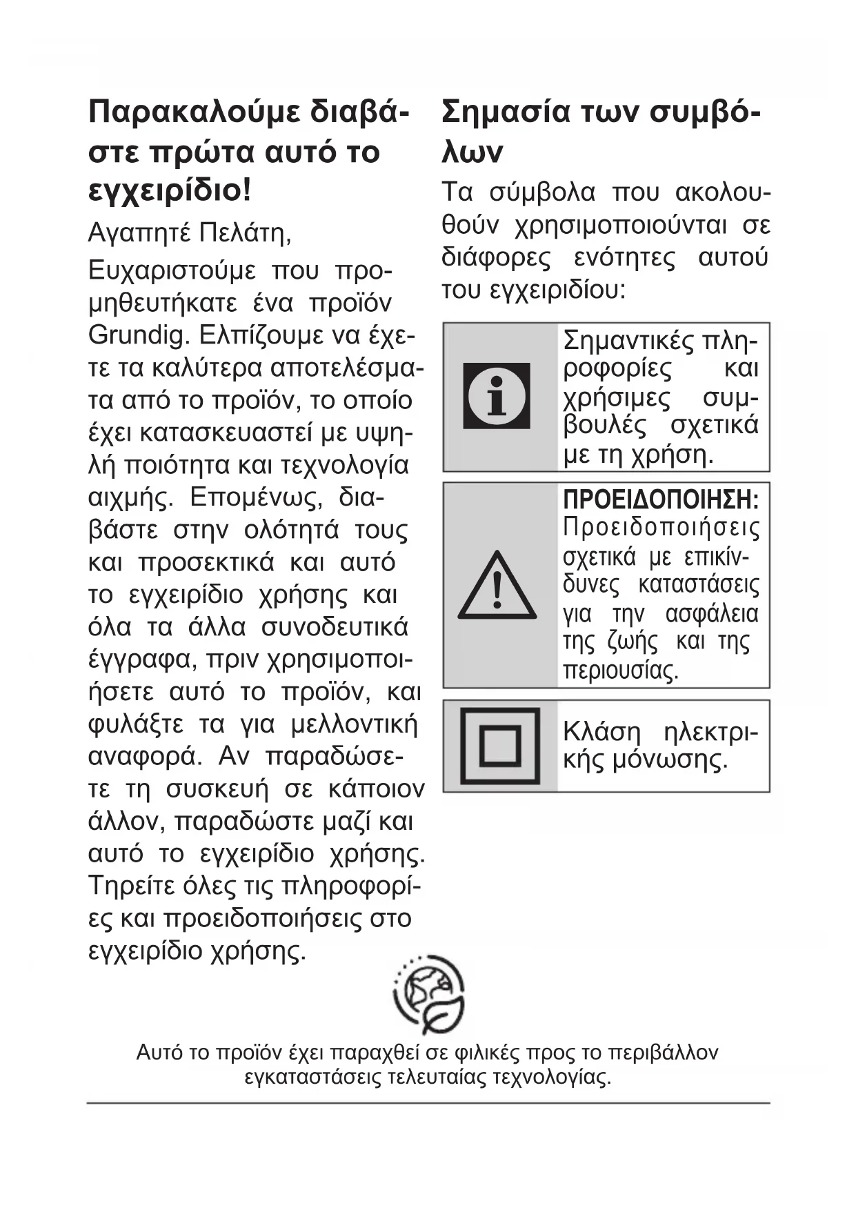 - Asigurați-vă că aparatul nu este la îndemâna copiilor. 4 Informații Pentru punerea în funcțiune, utilizare și curățare, respectați instrucțiunile de la paginile 4-5 din acest manual de utilizare.Παρακαλούμεδιαβά- στεπρώτααυτότο εγχειρίδιο! Αγαπητέ Πελάτη, Ευχαριστούμε που προ- μηθευτήκατε ένα προϊόν Grundig. Ελπίζουμε να έχε- τε τα καλύτερα αποτελέσμα- τα από το προϊόν, το οποίο έχει κατασκευαστεί με υψη- λή ποιότητα και τεχνολογία αιχμής. Επομένως, δια- βάστε στην ολότητά τους και προσεκτικά και αυτό το εγχειρίδιο χρήσης και όλα τα άλλα συνοδευτικά έγγραφα, πριν χρησιμοποι- ήσετε αυτό το προϊόν, και φυλάξτε τα για μελλοντική αναφορά. Αν παραδώσε- τε τη συσκευή σε κάποιον άλλον, παραδώστε μαζί και αυτό το εγχειρίδιο χρήσης. Τηρείτε όλες τις πληροφορί- ες και προειδοποιήσεις στο εγχειρίδιο χρήσης. Σημασίατωνσυμβό-