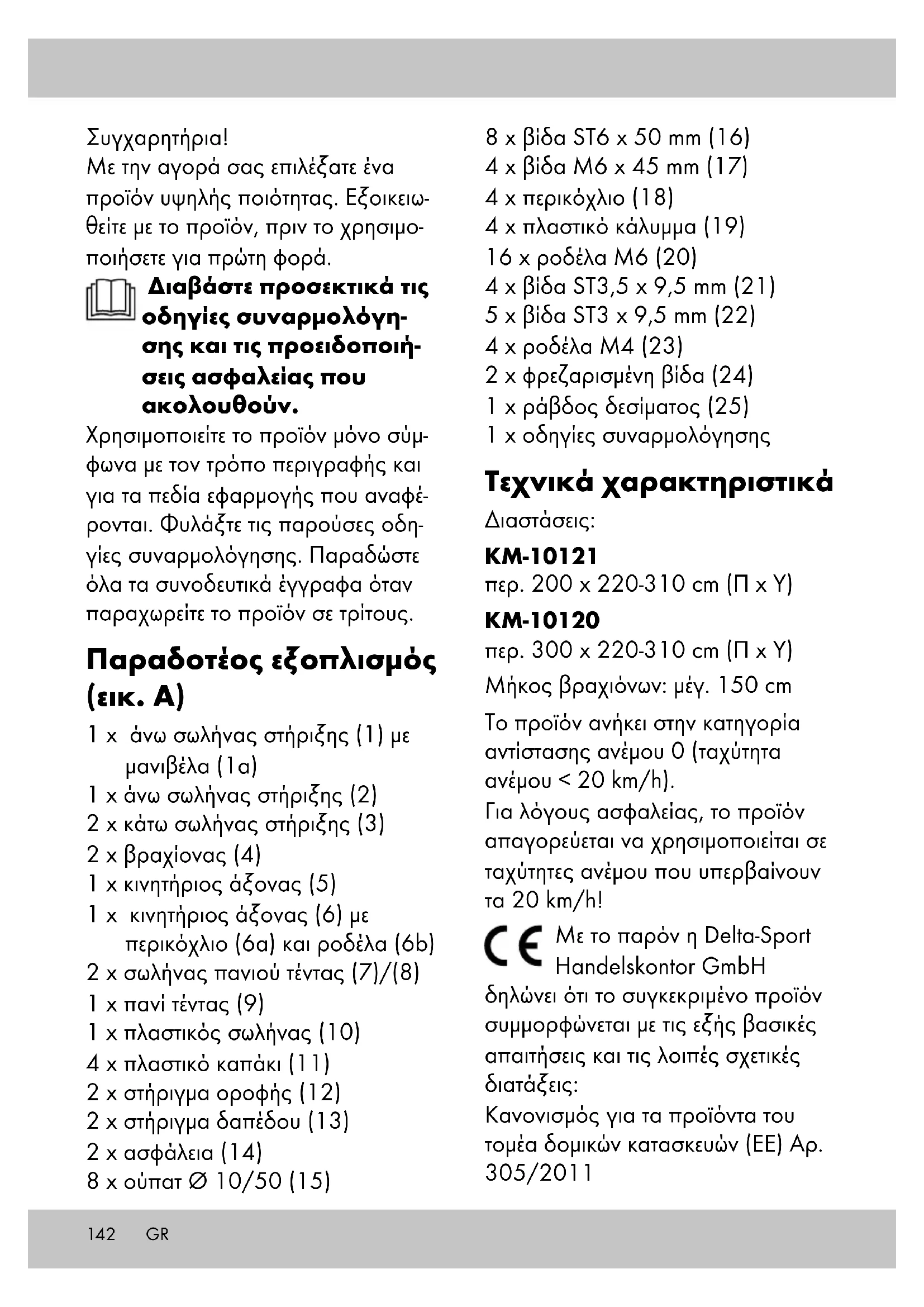 - Като физическо лице – потреби- тел, независимо от настоящата тър- говска гаранция, Вие се ползвате от правата на законовата гаран- ция, предоставена от Закона за предоставяне на цифрово съдър- жание и цифрови услуги и за про- дажбата на стоки /ЗПЦСЦУПС/. BG141BG По-специално Вие имате право при несъответствие на стоката да бъде извършен ремонт или замя- на по Ваш избор, освен ако това е невъзможно или е свързано с непропорционално големи разхо- ди за продавача. Вие имате право на пропорционално намаляване на цената или на разваляне на договора при наличие на условия- та на чл. 33, ал. 3 от ЗПЦСЦУПС. Условията и сроковете на законо- вата гаранция са регламентирани в глава трета, раздел II и III и в глава четвърта на ЗПЦСЦУПС. IAN: 409406_2207 IAN: 409416_2207 Сервизно обслужване България Тел.: 00800 111 4920 Е-мейл: deltasport@lidl.bg142 Συγχαρητήρια! Με την αγορά σας επιλέξατε ένα προϊόν υψηλής ποιότητας. Εξοικειω- θείτε με το προϊόν, πριν το χρησιμο- ποιήσετε για πρώτη φορά. Διαβάστε προσεκτικά τις οδηγίες συναρμολόγη- σης και τις προειδοποιή- σεις ασφαλείας που ακολουθούν. Χρησιμοποιείτε το προϊόν μόνο σύμ- φωνα με τον τρόπο περιγραφής και για τα πεδία εφαρμογής που αναφέ- ρονται. Φυλάξτε τις παρούσες οδη- γίες συναρμολόγησης. Παραδώστε όλα τα συνοδευτικά έγγραφα όταν παραχωρείτε το προϊόν σε τρίτους. Παραδοτέος εξοπλισμός (εικ. A) 1 x άνω σωλήνας στήριξης (1) με μανιβέλα (1a) 1 x άνω σωλήνας στήριξης (2) 2 x κάτω σωλήνας στήριξης (3) 2 x βραχίονας (4) 1 x κινητήριος άξονας (5) 1 x κινητήριος άξονας (6) με περικόχλιο (6a) και ροδέλα (6b) 2 x σωλήνας πανιού τέντας (7)/(8) 1 x πανί τέντας (9) 1 x πλαστικός σωλήνας (10) 4 x πλαστικό καπάκι (11) 2 x στήριγμα οροφής (12) 2 x στήριγμα δαπέδου (13) 2 x ασφάλεια (14) 8 x ούπατ Ø 10/50 (15) 8 x βίδα ST6 x 50 mm (16) 4 x βίδα M6 x 45 mm (17) 4 x περικόχλιο (18) 4 x πλαστικό κάλυμμα (19) 16 x ροδέλα M6 (20) 4 x βίδα ST3,5 x 9,5 mm (21) 5 x βίδα ST3 x 9,5 mm (22) 4 x ροδέλα M4 (23) 2 x φρεζαρισμένη βίδα (24) 1 x ράβδος δεσίματος (25) 1 x οδηγίες συναρμολόγησης Τεχνικά χαρακτηριστικά Διαστάσεις: KM-10121 περ. 200 x 220-310 cm (Π x Υ) KM-10120 περ. 300 x 220-310 cm (Π x Υ) Μήκος βραχιόνων: μέγ. 150 cm Το προϊόν ανήκει στην κατηγορία αντίστασης ανέμου 0 (ταχύτητα ανέμου < 20 km/h). Για λόγους ασφαλείας, το προϊόν απαγορεύεται να χρησιμοποιείται σε ταχύτητες ανέμου που υπερβαίνουν τα 20 km/h! Με το παρόν η Delta-Sport Handelskontor GmbH δηλώνει ότι το συγκεκριμένο προϊόν συμμορφώνεται με τις εξής βασικές απαιτήσεις και τις λοιπές σχετικές