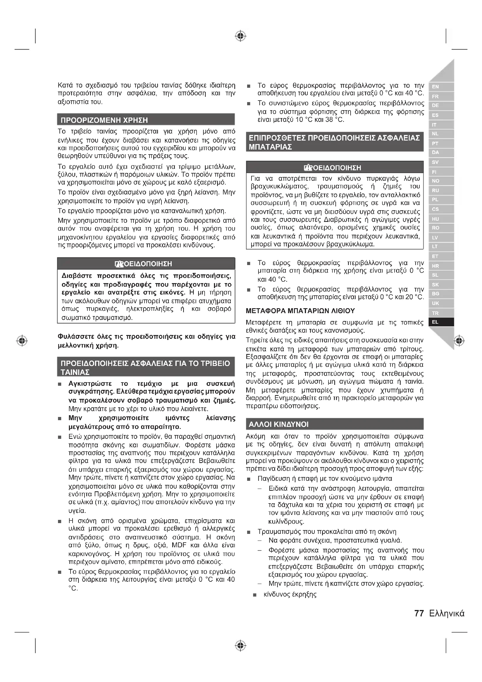 ΠΡΟΕΙΔΟΠΟΙΗΣΗ Για να αποτρέπεται τον κίνδυνο πυρκαγιάς λόγω βραχυκυκλώματος, τραυματισμούς ή ζημιές του προϊόντος, να μη βυθίζετε το εργαλείο, τον ανταλλακτικό συσσωρευτή ή τη συσκευή φόρτισης σε υγρά και να φροντίζετε, ώστε να μη διεισδύουν υγρά στις συσκευές και τους συσσωρευτές Διαβρωτικές ή αγώγιμες υγρές ουσίες, όπως αλατόνερο, ορισμένες χημικές ουσίες και λευκαντικά ή προϊόντα που περιέχουν λευκαντικά, μπορεί να προκαλέσουν βραχυκύκλωμα. ■ Το εύρος θερμοκρασίας περιβάλλοντος για την μπαταρία στη διάρκεια της χρήσης είναι μεταξύ 0 °C και 40 °C. ■ Το εύρος θερμοκρασίας περιβάλλοντος για την αποθήκευση της μπαταρίας είναι μεταξύ 0 °C και 20 °C. ΜΕΤΑΦΟΡΑ ΜΠΑΤΑΡΙΩΝ ΛΙΘΙΟΥ Μεταφέρετε τη μπαταρία σε συμφωνία με τις τοπικές εθνικές διατάξεις και τους κανονισμούς. Τηρείτε όλες τις ειδικές απαιτήσεις στη συσκευασία και στην ετικέτα κατά τη μεταφορά των μπαταριών από τρίτους. Εξασφαλίζετε ότι δεν θα έρχονται σε επαφή οι μπαταρίες με άλλες μπαταρίες ή με αγώγιμα υλικά κατά τη διάρκεια της μεταφοράς, προστατεύοντας τους εκτεθειμένους συνδέσμους με μόνωση, μη αγώγιμα πώματα ή ταινία. Μη μεταφέρετε μπαταρίες που έχουν χτυπήματα ή διαρροή. Ενημερωθείτε από τη πρακτορείο μεταφορών για περαιτέρω ειδοποιήσεις. ΑΛΛΟΙ ΚΙΝΔΥΝΟΙ Ακόμη και όταν το προϊόν χρησιμοποιείται σύμφωνα με τις οδηγίες, δεν είναι δυνατή η απόλυτη απαλειφή συγκεκριμένων παραγόντων κινδύνου. Κατά τη χρήση μπορεί να προκύψουν οι ακόλουθοι κίνδυνοι και ο χειριστής πρέπει να δίδει ιδιαίτερη προσοχή προς αποφυγή των εξής: ■ Παγίδευση ή επαφή με τον κινούμενο ιμάντα – Ειδικά κατά την ανάστροφη λειτουργία, απαιτείται επιπλέον προσοχή ώστε να μην έρθουν σε επαφή τα δάχτυλα και τα χέρια του χειριστή σε επαφή με τον ιμάντα λείανσης και να μην πιαστούν από τους κυλίνδρους. ■ Τραυματισμός που προκαλείται από τη σκόνη – Να φοράτε συνέχεια, προστατευτικά γυαλιά. – Φορέστε μάσκα προστασίας της αναπνοής που περιέχουν κατάλληλα φίλτρα για τα υλικά που επεξεργάζεστε Βεβαιωθείτε ότι υπάρχει επαρκής εξαερισμός του χώρου εργασίας. – Μην τρώτε, πίνετε ή καπνίζετε στον χώρο εργασίας. ■ κίνδυνος έκρηξης78 | Ελληνικά – Η συγκέντρωση λεπτής σκόνης μπορεί να προκαλέσει ανάφλεξη και φωτιά. Διατηρείτε τον χώρο εργασίας καθαρό και χωρίς σκόνη. Τα συστήματα συλλογής σκόνης και σκουπών απώθησης θα πρέπει να καθαρίζονται τακτικά και προσεκτικά. Κατά την τριβή μετάλλου, υπάρχει πιθανότητα δημιουργίας θερμών σπινθήρων. ■ θόρυβος και κραδασμοί – Φοράτε προστατευτικά αυτιών όταν χειρίζεστε το προϊόν. Μην χρησιμοποιείτε το προϊόν για μεγάλα χρονικά διαστήματα. ΜΕΙΩΣΗ ΚΙΝΔΥΝΟΥ Έχει αναφερθεί ότι οι κραδασμοί των χειροκίνητων εργαλείων μπορεί να συμβάλλει σε μια πάθηση γνωστή ως Σύνδρομο Raynaud σε ορισμένα άτομα. Τα συμπτώματα περιλαμβάνουν κνησμό, μούδιασμα και λευκότητα των δακτύλων, που εμφανίζονται συνήθως μετά την έκθεση σε κρύο. Κληρονομικοί παράγοντες, έκθεση σε κρύο και υγρασία, κάπνισμα και πρακτικές εργασίας θεωρείται ότι συμβάλλουν στην εκδήλωση των συμπτωμάτων. Υπάρχουν μέτρα που μπορούν να ληφθούν από τον χειριστή για να μειωθούν πιθανώς οι επιδράσεις των