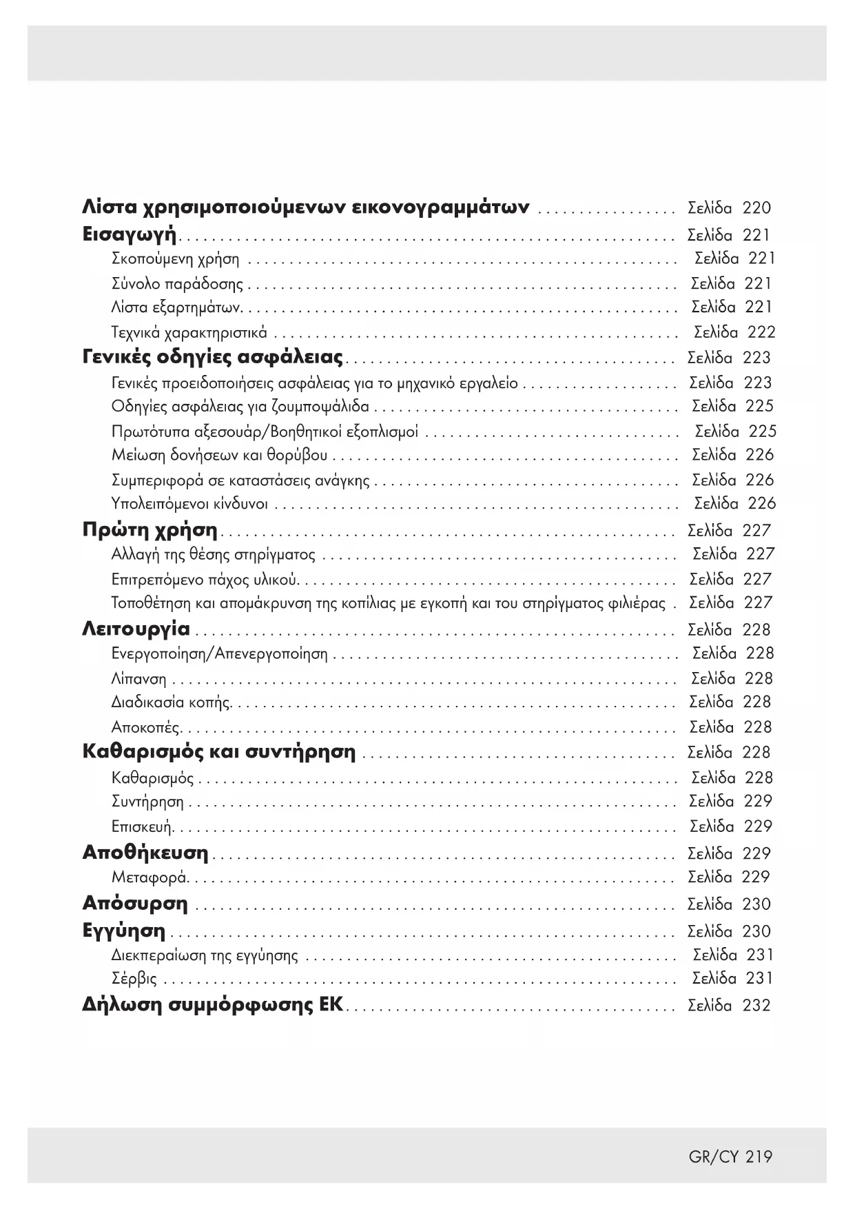 Декларация за съответствие за ЕО219 GR/CY Λίστα χρησιμοποιούμενων εικονογραμμάτων ................. Σελίδα 220 Εισαγωγή............................................................ Σελίδα 221 Σκοπούμενη χρήση .................................................... Σελίδα 221 Σύνολο παράδοσης .................................................... Σελίδα 221 Λίστα εξαρτημάτων..................................................... Σελίδα 221 Τεχνικά χαρακτηριστικά ................................................. Σελίδα 222 Γενικές οδηγίες ασφάλειας........................................ Σελίδα 223 Γενικές προειδοποιήσεις ασφάλειας για το μηχανικό εργαλείο ................... Σελίδα 223 Οδηγίες ασφάλειας για ζουμποψάλιδα ..................................... Σελίδα 225 Πρωτότυπα αξεσουάρ/Βοηθητικοί εξοπλισμοί ............................... Σελίδα 225 Μείωση δονήσεων και θορύβου .......................................... Σελίδα 226 Συμπεριφορά σε καταστάσεις ανάγκης ..................................... Σελίδα 226 Υπολειπόμενοι κίνδυνοι ................................................. Σελίδα 226 Πρώτη χρήση....................................................... Σελίδα 227 Αλλαγή της θέσης στηρίγματος ........................................... Σελίδα 227 Επιτρεπόμενο πάχος υλικού.............................................. Σελίδα 227 Τοποθέτηση και απομάκρυνση της κοπίλιας με εγκοπή και του στηρίγματος φιλιέρας . Σελίδα 227 Λειτουργία .......................................................... Σελίδα 228 Ενεργοποίηση/Απενεργοποίηση .......................................... Σελίδα 228 Λίπανση ............................................................. Σελίδα 228 Διαδικασία κοπής...................................................... Σελίδα 228 Αποκοπές............................................................ Σελίδα 228 Καθαρισμός και συντήρηση ...................................... Σελίδα 228 Καθαρισμός .......................................................... Σελίδα 228 Συντήρηση . . . . . . . . . . . . . . . . . . . . . . . . . . . . . . . . . . . . . . . . . . . . . . . . . . . . . . . . . . . Σελίδα 229 Επισκευή............................................................. Σελίδα 229 Αποθήκευση........................................................ Σελίδα 229 Μεταφορά........................................................... Σελίδα 229 Απόσυρση .......................................................... Σελίδα 230 Εγγύηση ............................................................. Σελίδα 230 Διεκπεραίωση της εγγύησης ............................................. Σελίδα 231 Σέρβις .............................................................. Σελίδα 231 Δήλωση συμμόρφωσης ΕΚ........................................ Σελίδα 232220 GR/CY Λίστα χρησιμοποιούμενων εικονογραμμάτων Οι ακόλουθες προειδοποιήσεις χρησιμοποιούνται στο παρόν εγχειρίδιο χρήστη, στη συσκευασία και στην πινακίδα τύπου: Διαβάστε το εγχειρίδιο χρήστη. Κατηγορία προστασίας ΙΙ (διπλή