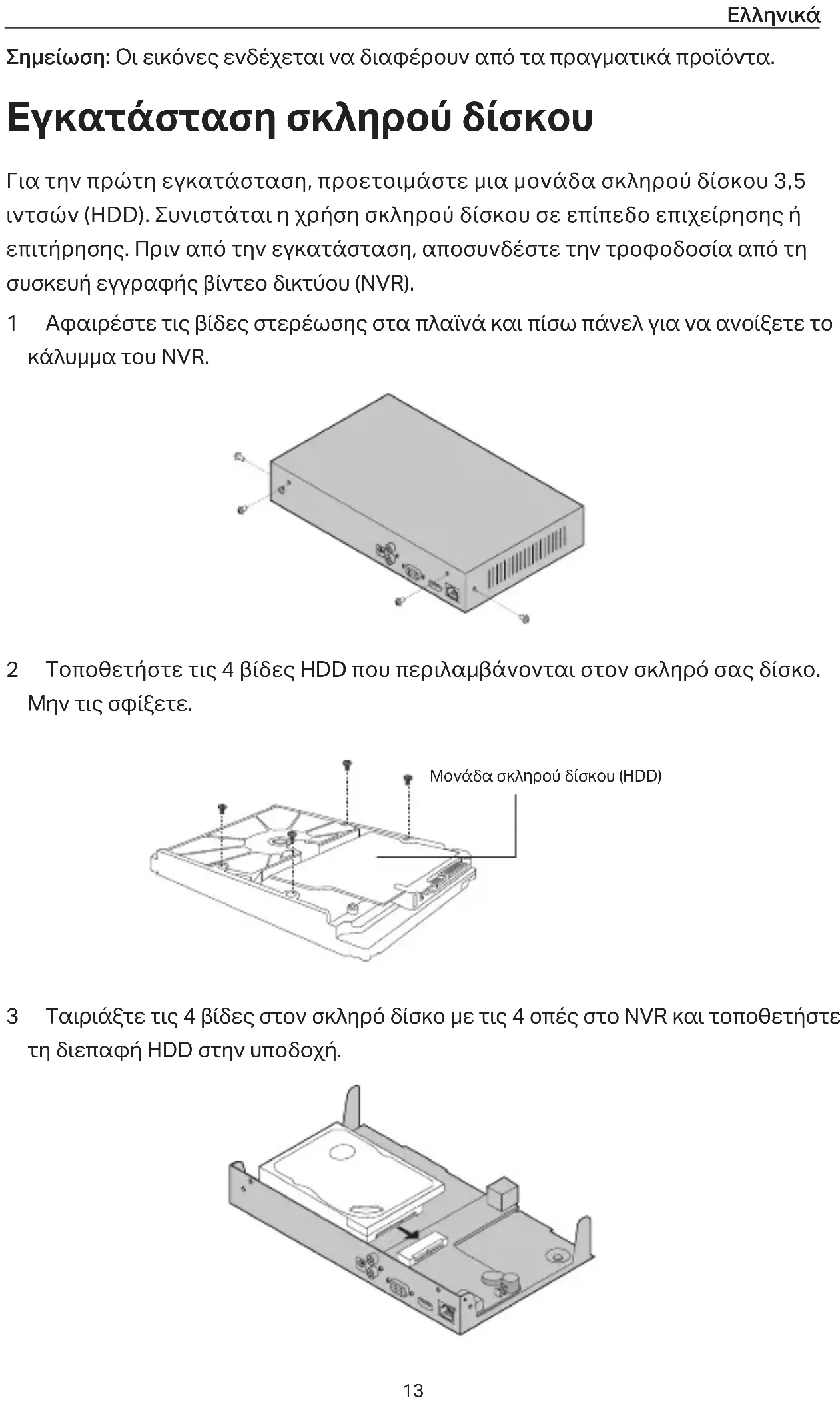 Σημείωση: Οι εικόνες ενδέχεται να διαφέρουν από τα πραγματικά προϊόντα. Εγκατάσταση σκληρού δίσκου Για την πρώτη εγκατάσταση, προετοιμάστε μια μονάδα σκληρού δίσκου 3,5 ιντσών (HDD). Συνιστάται η χρήση σκληρού δίσκου σε επίπεδο επιχείρησης ή επιτήρησης. Πριν από την εγκατάσταση, αποσυνδέστε την τροφοδοσία από τη συσκευή εγγραφής βίντεο δικτύου (NVR). 1 Αφαιρέστε τις βίδες στερέωσης στα πλαϊνά και πίσω πάνελ για να ανοίξετε το κάλυμμα του NVR. 2 Τοποθετήστε τις 4 βίδες HDD που περιλαμβάνονται στον σκληρό σας δίσκο. Μην τις σφίξετε. Μονάδα σκληρού δίσκου (HDD) 3 Ταιριάξτε τις 4 βίδες στον σκληρό δίσκο με τις 4 οπές στο NVR και τοποθετήστε τη διεπαφή HDD στην υποδοχή.Eλληνικά