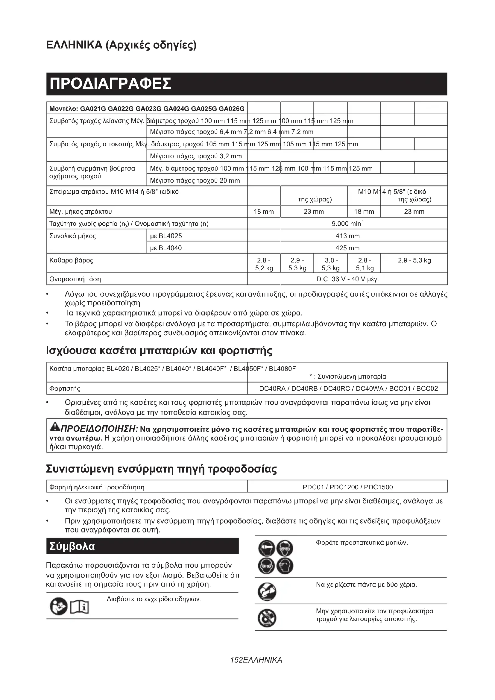 - Unidade sem os (para modelos com a função de ativação sem os) NOTA: Alguns itens da lista podem estar incluídos na embalagem da ferramenta como acessórios padrão. Eles podem variar de país para país.152 ΕΛΛΗΝΙΚΑ ΕΛΛΗΝΙΚΑ (Αρχικές οδηγίες) ΠΡΟΔΙΑΓΡΑΦΕΣ Μοντέλο: GA021G GA022G GA023G GA024G GA025G GA026G Συμβατός τροχός λείανσης Μέγ. διάμετρος τροχού 100 mm 115 mm 125 mm 100 mm 115 mm 125 mm Μέγιστο πάχος τροχού 6,4 mm 7,2 mm 6,4 mm 7,2 mm Συμβατός τροχός αποκοπής Μέγ. διάμετρος τροχού 105 mm 115 mm 125 mm 105 mm 115 mm 125 mm Μέγιστο πάχος τροχού 3,2 mm Συμβατή συρμάτινη βούρτσα σχήματος τροχού Μέγ. διάμετρος τροχού 100 mm 115 mm 125 mm 100 mm 115 mm 125 mm Μέγιστο πάχος τροχού 20 mm Σπείρωμα ατράκτου M10 M14 ή 5/8″ (ειδικό