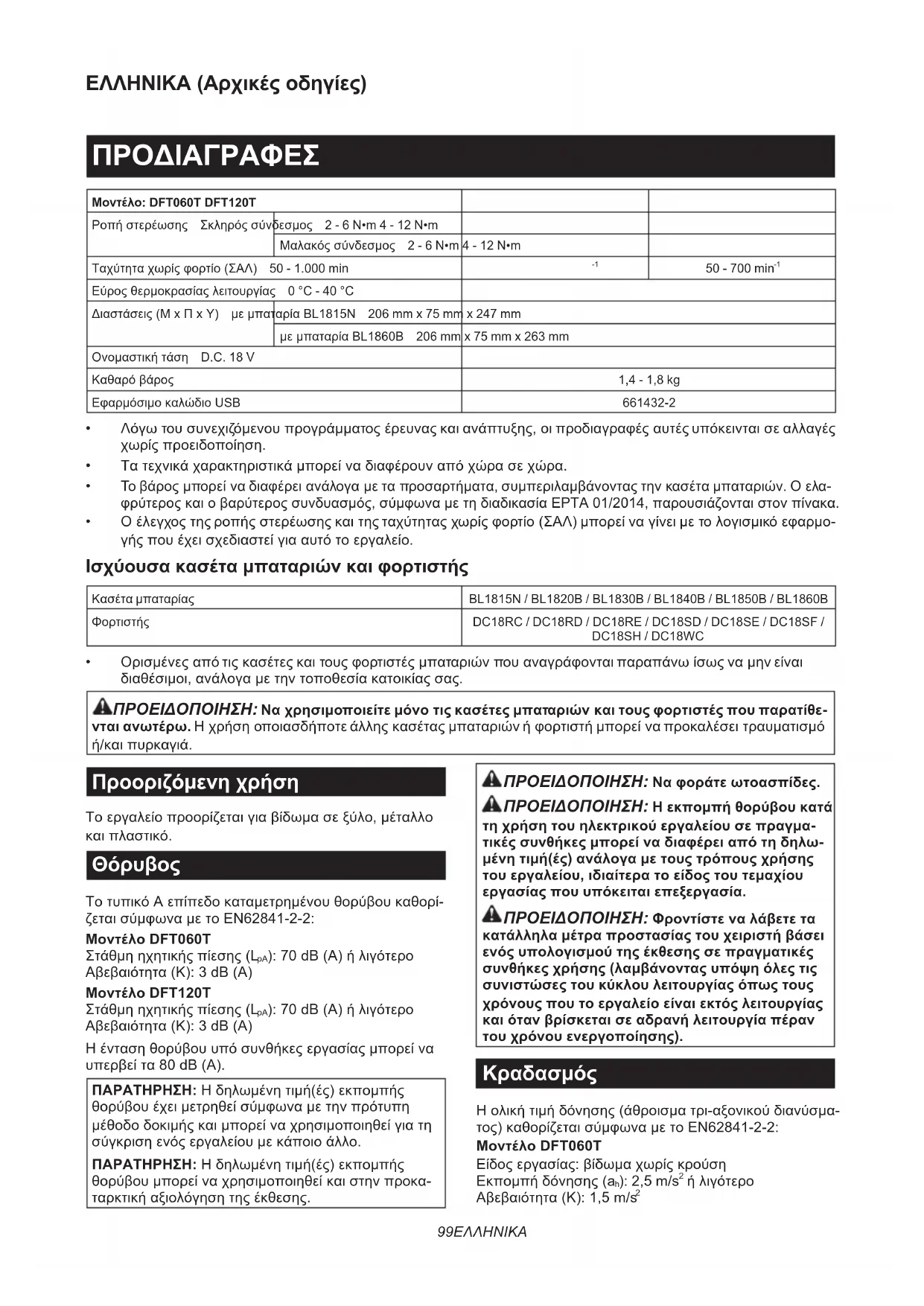 Εύροςθερμοκρασίαςλειτουργίας 0 °C - 40 °CΔιαστάσεις(ΜxΠxΥ) μεμπαταρίαBL1815N 206 mm x 75 mm x 247 mmμεμπαταρίαBL1860B 206 mm x 75 mm x 263 mmΟνομαστικήτάση D.C. 18 VΚαθαρόβάρος 1,4 - 1,8 kgΕφαρμόσιμοκαλώδιοUSB 661432-2