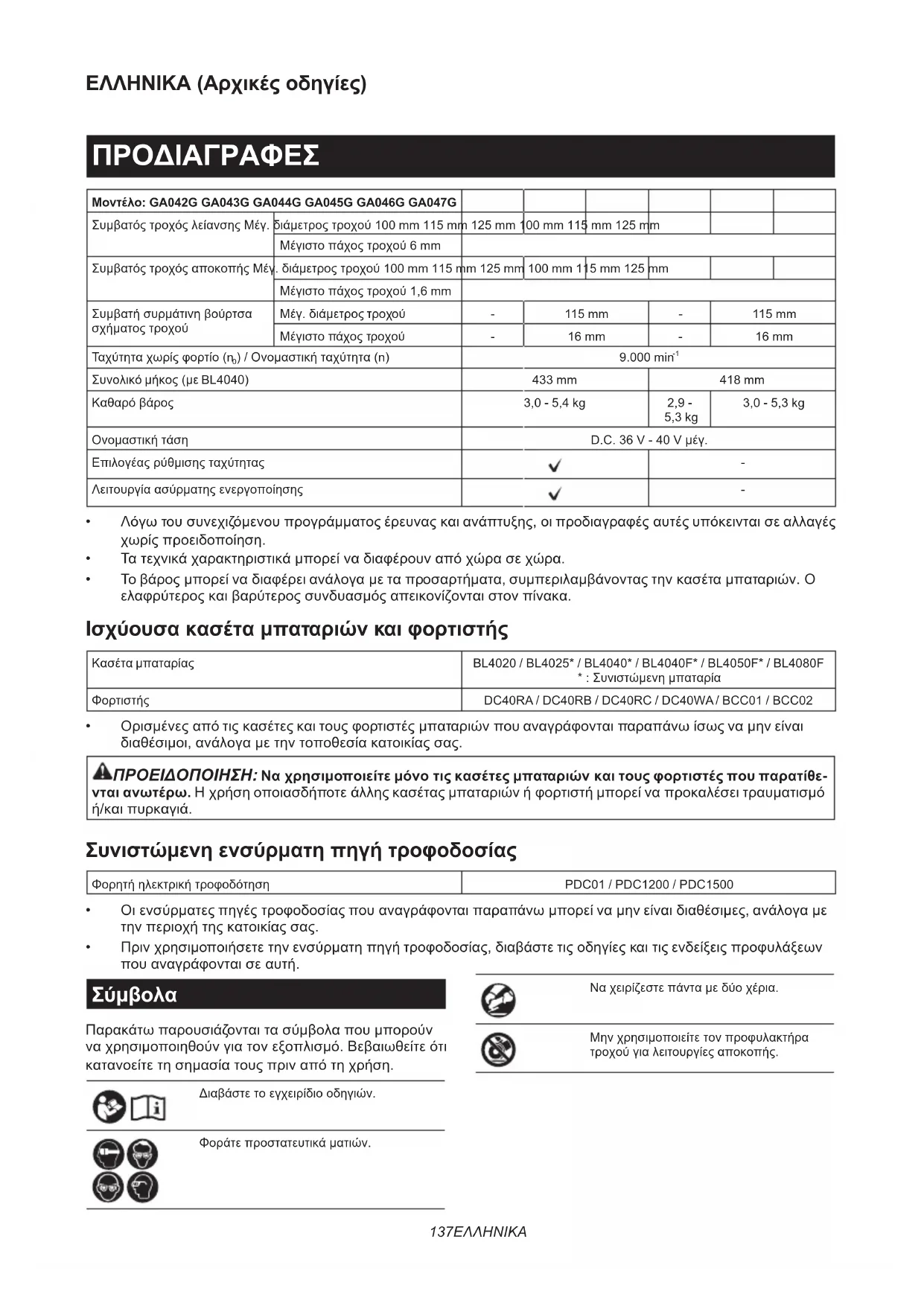 NOTA: Alguns itens da lista podem estar incluídos na embalagem da ferramenta como acessórios padrão. Eles podem variar de país para país.137 ΕΛΛΗΝΙΚΑ ΕΛΛΗΝΙΚΑ (Αρχικές οδηγίες) ΠΡΟΔΙΑΓΡΑΦΕΣ Μοντέλο: GA042G GA043G GA044G GA045G GA046G GA047G Συμβατός τροχός λείανσης Μέγ. διάμετρος τροχού 100 mm 115 mm 125 mm 100 mm 115 mm 125 mm Μέγιστο πάχος τροχού 6 mm Συμβατός τροχός αποκοπής Μέγ. διάμετρος τροχού 100 mm 115 mm 125 mm 100 mm 115 mm 125 mm Μέγιστο πάχος τροχού 1,6 mm Συμβατή συρμάτινη βούρτσα σχήματος τροχού Μέγ. διάμετρος τροχού - 115 mm - 115 mm Μέγιστο πάχος τροχού - 16 mm - 16 mm Ταχύτητα χωρίς φορτίο (n
