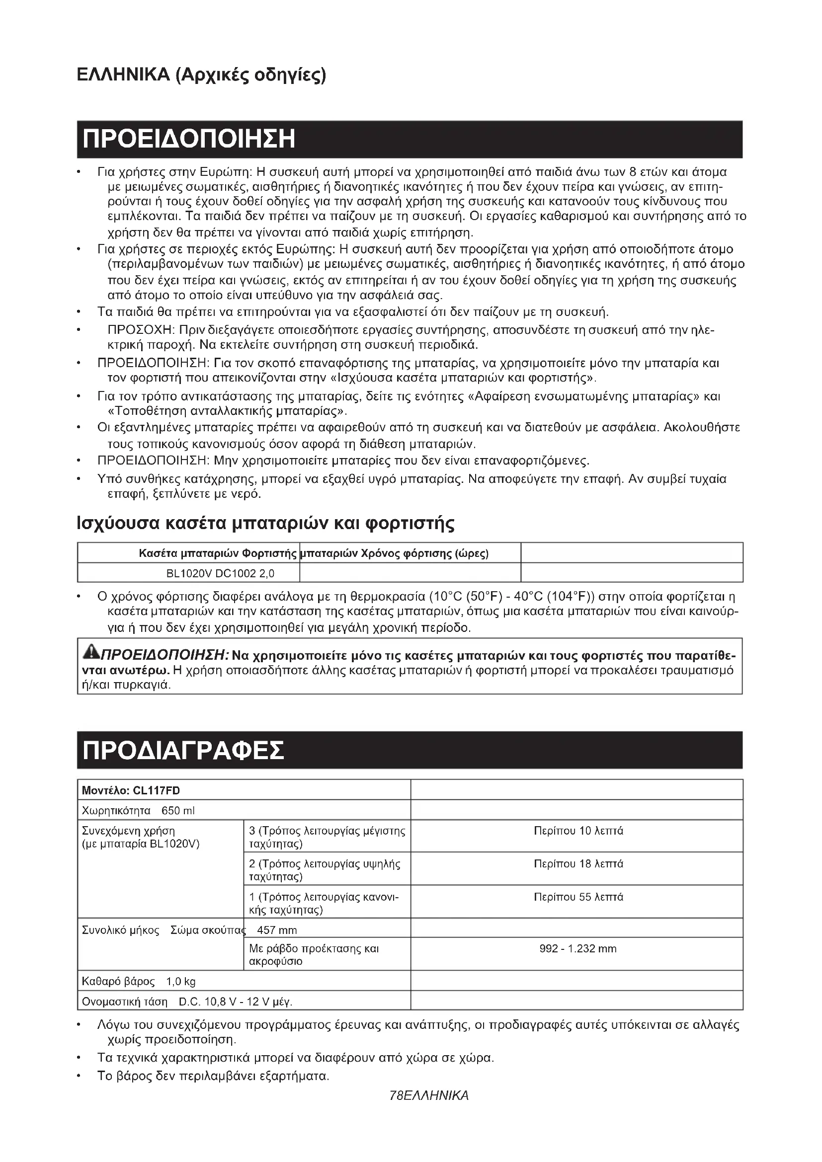 - Οχρόνοςφόρτισηςδιαφέρειανάλογαμετηθερμοκρασία(10°C(50°F)-40°C(104°F))στηνοποίαφορτίζεταιη κασέταμπαταριώνκαιτηνκατάστασητηςκασέταςμπαταριών,όπωςμιακασέταμπαταριώνπουείναικαινούρ- γιαήπουδενέχειχρησιμοποιηθείγιαμεγάληχρονικήπερίοδο. ΠΡΟΕΙΔΟΠΟΙΗΣΗ: Να χρησιμοποιείτε μόνο τις κασέτες μπαταριών και τους φορτιστές που παρατίθε- νται ανωτέρω.Ηχρήσηοποιασδήποτεάλληςκασέταςμπαταριώνήφορτιστήμπορείναπροκαλέσειτραυματισμό ή/καιπυρκαγιά. ΠΡΟΔΙΑΓΡΑΦΕΣ Μοντέλο: CL117FD Χωρητικότητα 650 ml Συνεχόμενηχρήση (μεμπαταρίαBL1020V) 3(Τρόποςλειτουργίαςμέγιστης