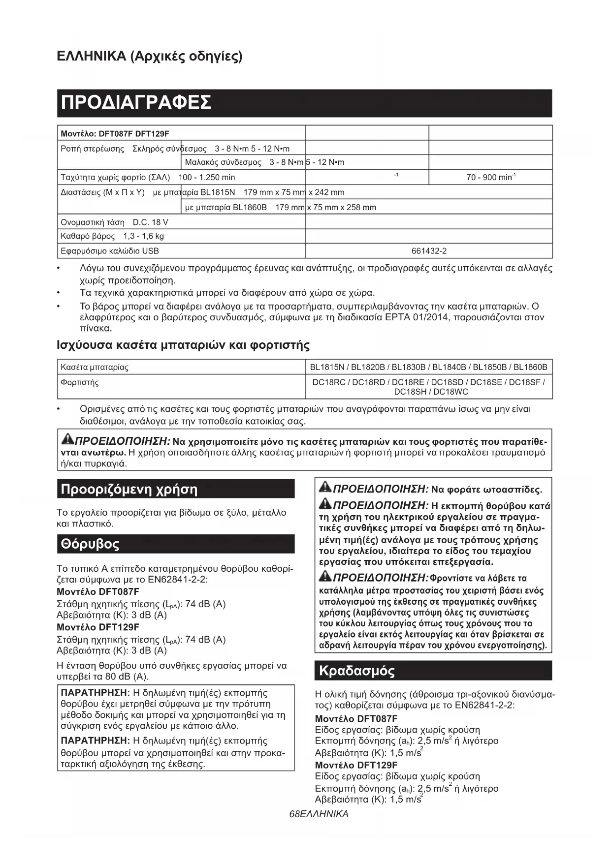 ΤοτυπικόΑεπίπεδοκαταμετρημένουθορύβουκαθορί- ζεταισύμφωναμετοEN62841-2-2: Μοντέλο DFT087F Στάθμηηχητικήςπίεσης(L