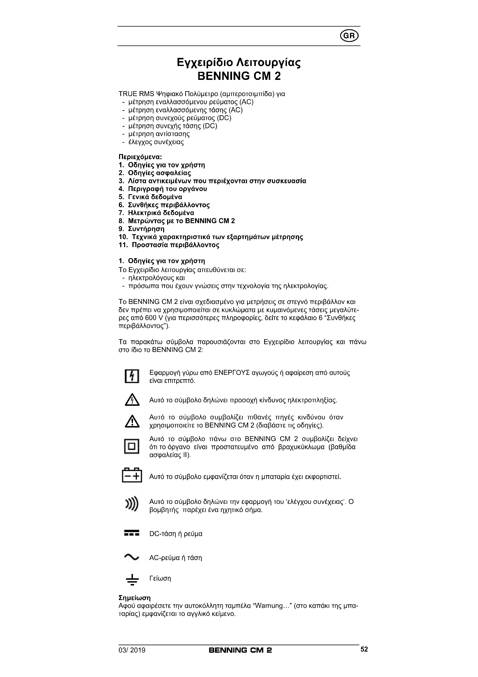 Οδηγίες για τα αναλώσιμα εξαρτήματα: - Το BENNING CM 2 παρέχεται με δύο 1.5 V μικρές μπαταρίες (2 x 1.5 V IEC LR 03) - Τα αναφερόμενα παραπάνω καλώδια ασφαλείας (δοκιμασμένο ανταλλακτι- κό (no. 044145)) παρέχονται σύμφωνα με το CAT III 1000 V και για ρεύμα μέχρι 10 A.03/ 2019 BENNING CM 2