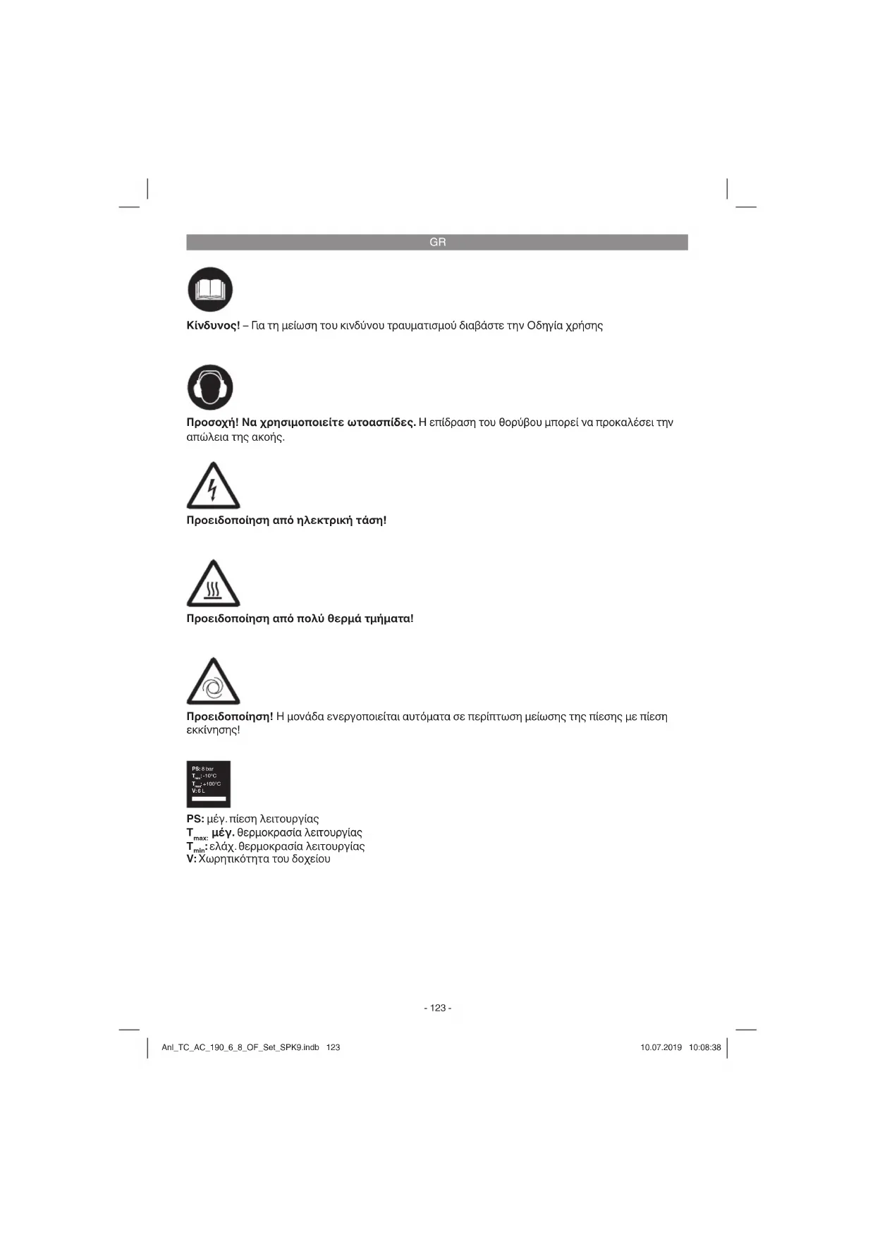 Προσοχή! Να χρησιμοποιείτε ωτοασπίδες. Η επίδραση του θορύβου μπορεί να προκαλέσει την απώλεια της ακοής. Κίνδυνος! – Για τη μείωση του κινδύνου τραυματισμού διαβάστε την Οδηγία χρήσης Προειδοποίηση από ηλεκτρική τάση! Προειδοποίηση από πολύ θερμά τμήματα! Προειδοποίηση! Η μονάδα ενεργοποιείται αυτόματα σε περίπτωση μείωσης της πίεσης με πίεση