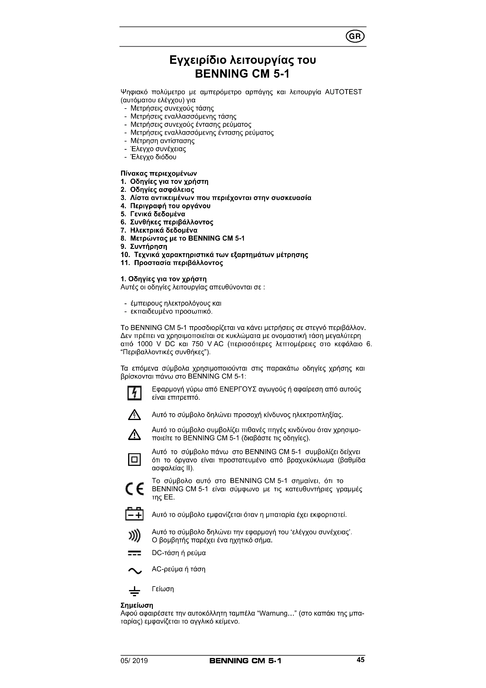 Αυτές οι οδηγίες λειτουργίας απευθύνονται σε : - έμπειρους ηλεκτρολόγους και - εκπαιδευμένο προσωπικό. Το BENNING CM 5-1 προσδιορίζεται να κάνει μετρήσεις σε στεγνό περιβάλλον. Δεν πρέπει να χρησιμοποιείται σε κυκλώματα με ονομαστική τάση μεγαλύτερη από 1000 V DC και 750 V AC (περισσότερες λεπτομέρειες στο κεφάλαιο 6. “Περιβαλλοντικές συνθήκες”). Τα επόμενα σύμβολα χρησιμοποιούνται στις παρακάτω οδηγίες χρήσης και βρίσκονται πάνω στο BENNING CM 5-1: Εφαρμογή γύρω από ΕΝΕΡΓΟΥΣ αγωγούς ή αφαίρεση από αυτούς είναι επιτρεπτό.