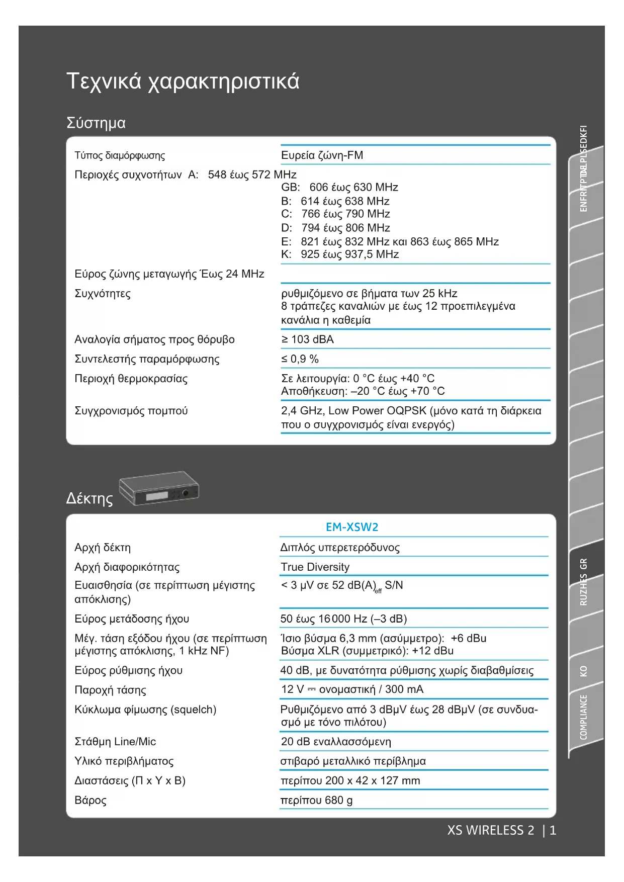 COMPLIANCE Τεχνικά χαρακτηριστικά Τύπος διαμόρφωσης Ευρεία ζώνη-FM Περιοχές συχνοτήτων A: 548 έως 572 MHz GB: 606 έως 630 MHz B: 614 έως 638 MHz C: 766 έως 790 MHz D: 794 έως 806 MHz E: 821 έως 832 MHz και 863 έως 865 MHz K: 925 έως 937,5 MHz Εύρος ζώνης μεταγωγής Έως 24 MHz Συχνότητες ρυθμιζόμενο σε βήματα των 25 kHz 8 τράπεζες καναλιών με έως 12 προεπιλεγμένα κανάλια η καθεμία Αναλογία σήματος προς θόρυβο ≥ 103 dBA Συντελεστής παραμόρφωσης ≤ 0,9 % Περιοχή θερμοκρασίας Σε λειτουργία: 0 °C έως +40 °C Αποθήκευση: –20 °C έως +70 °C Συγχρονισμός πομπού 2,4 GHz, Low Power OQPSK (μόνο κατά τη διάρκεια που ο συγχρονισμός είναι ενεργός)