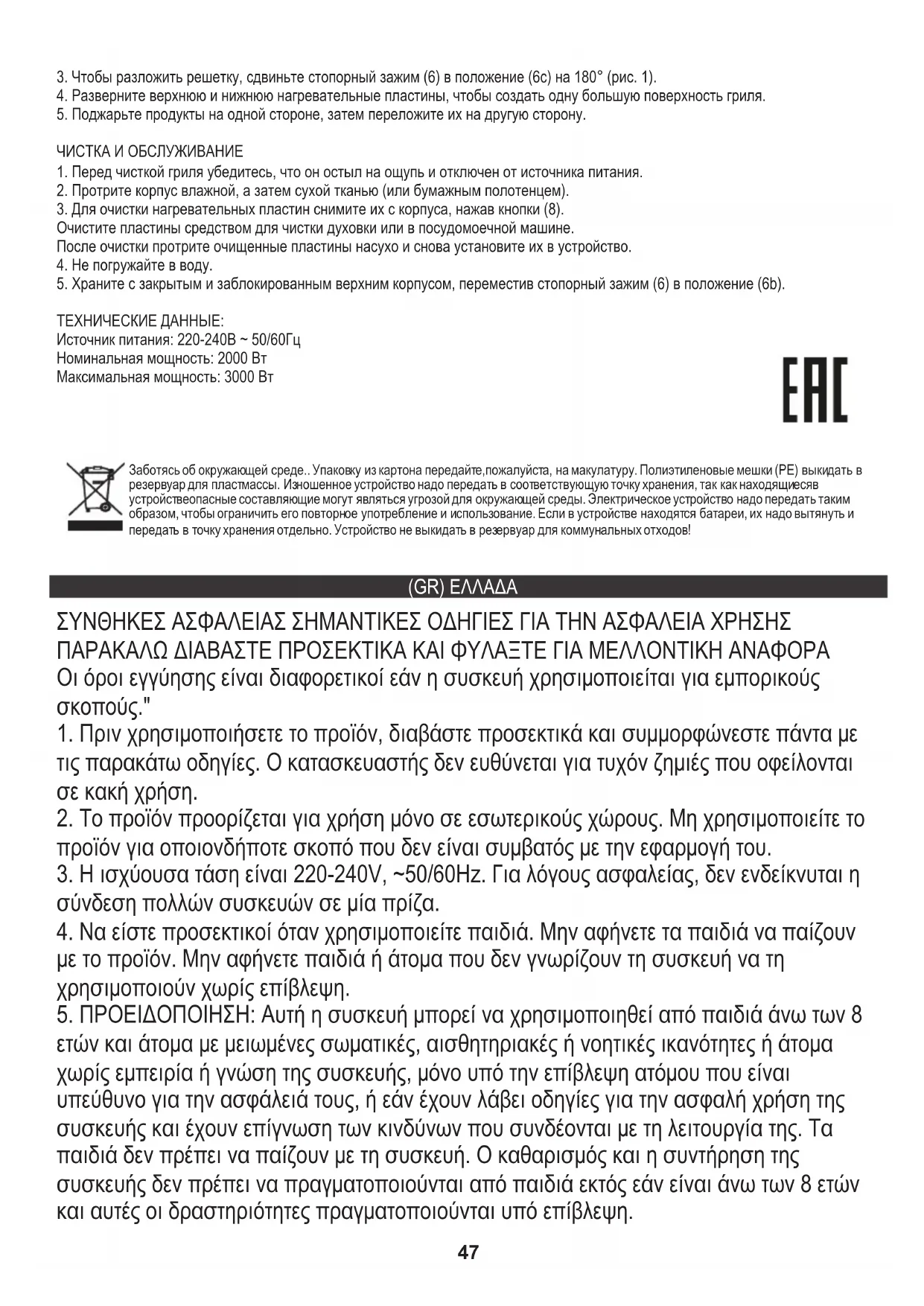 Πηγή ισχύος: 220-240V ~ 50 / 60Hz ΤΕΧΝΙΚΑ ΔΕΔΟΜΕΝΑ: φροντίζουμε το φυσικό περιβάλλον. Παρακαλούμε να πετάτε τις συσκευασίες από χαρτόνι στον κάδο ανακύκλωσης απορριμμάτων χαρτιού. Τις σακούλες από πολυαιθυλένιο (ΡΕ), απορρίψτε τις στον κάδο ανακύκλωσης πλαστικών. Η φθαρμένη συσκευή πρέπει να απορρίπτεται στο κατάλληλο σημείο, εξαιτίας των επικίνδυνων στοιχείων που περιέχει και τα οποία μπορεί να αποτελέσουν απειλή για το περιβάλλον. Η ηλεκτρική συσκευή πρέπει να απορρίπτεται με τέτοιο τρόπο ώστε να περιοριστεί η επαναχρησιμοποίηση της. Εάν στη συσκευή βρίσκονται μπαταρίες, αυτές πρέπει να αφαιρεθούν και να πεταχτούν σε ξεχωριστό κάδο.51