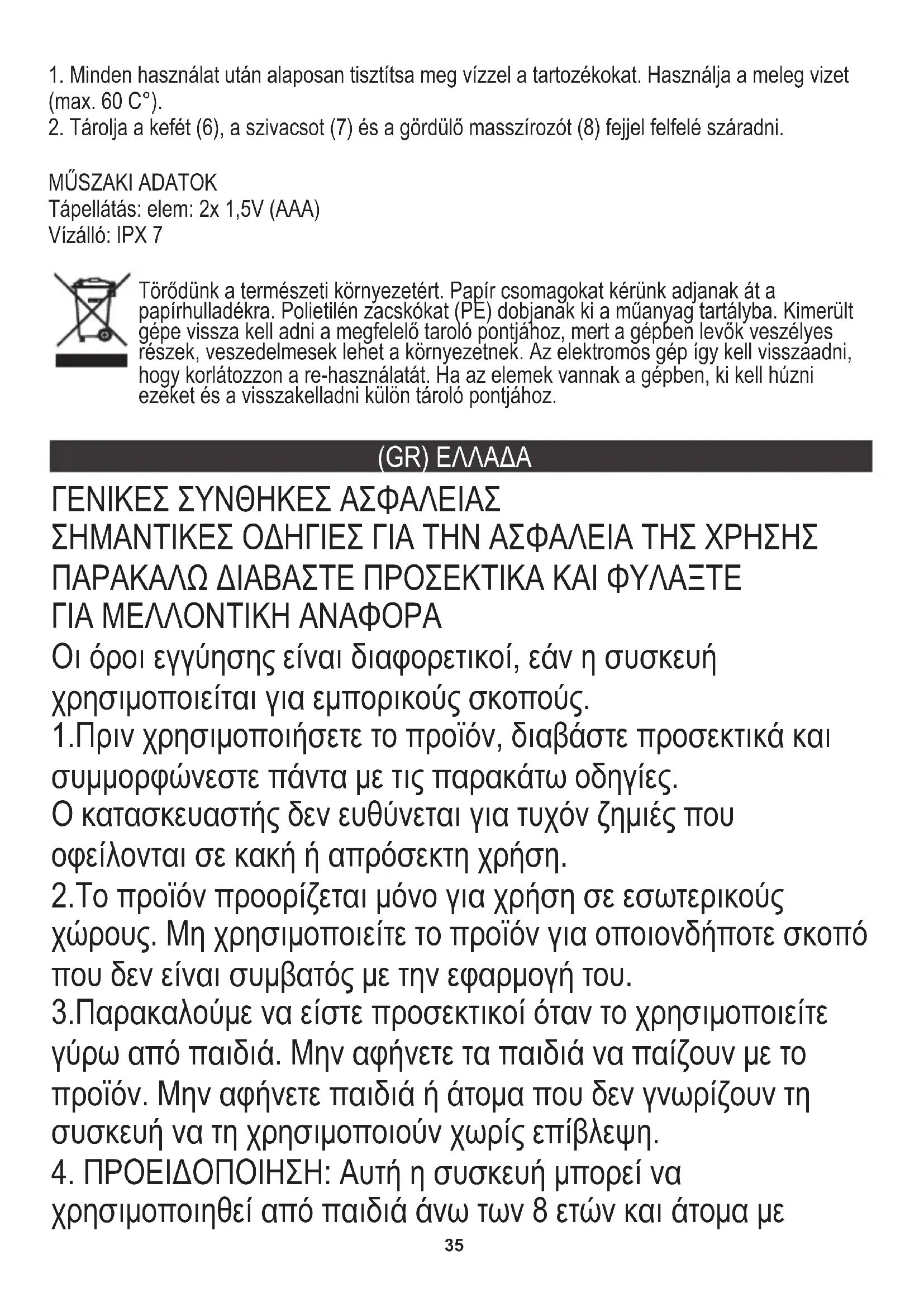 Tápellátás: elem: 2x 1,5V (AAA) Törődünk a természeti környezetért. Papír csomagokat kérünk adjanak át a papírhulladékra. Polietilén zacskókat (PE) dobjanak ki a műanyag tartályba. Kimerült gépe vissza kell adni a megfelelő taroló pontjához, mert a gépben levők veszélyes részek, veszedelmesek lehet a környezetnek. Az elektromos gép így kell visszaadni, hogy korlátozzon a re-használatát. Ha az elemek vannak a gépben, ki kell húzni ezeket és a visszakelladni külön tároló pontjához. (GR) ΕΛΛΑΔΑ ΓΕΝΙΚΕΣ ΣΥΝΘΗΚΕΣ ΑΣΦΑΛΕΙΑΣ ΣΗΜΑΝΤΙΚΕΣ ΟΔΗΓΙΕΣ ΓΙΑ ΤΗΝ ΑΣΦΑΛΕΙΑ ΤΗΣ ΧΡΗΣΗΣ ΠΑΡΑΚΑΛΩ ΔΙΑΒΑΣΤΕ ΠΡΟΣΕΚΤΙΚΑ ΚΑΙ ΦΥΛΑΞΤΕ ΓΙΑ ΜΕΛΛΟΝΤΙΚΗ ΑΝΑΦΟΡΑ 3.Παρακαλούμε να είστε προσεκτικοί όταν το χρησιμοποιείτε γύρω από παιδιά. Μην αφήνετε τα παιδιά να παίζουν με το προϊόν. Μην αφήνετε παιδιά ή άτομα που δεν γνωρίζουν τη συσκευή να τη χρησιμοποιούν χωρίς επίβλεψη. Ο κατασκευαστής δεν ευθύνεται για τυχόν ζημιές που οφείλονται σε κακή ή απρόσεκτη χρήση. 2.Το προϊόν προορίζεται μόνο για χρήση σε εσωτερικούς χώρους. Μη χρησιμοποιείτε το προϊόν για οποιονδήποτε σκοπό που δεν είναι συμβατός με την εφαρμογή του. 1.Πριν χρησιμοποιήσετε το προϊόν, διαβάστε προσεκτικά και συμμορφώνεστε πάντα με τις παρακάτω οδηγίες. Οι όροι εγγύησης είναι διαφορετικοί, εάν η συσκευή χρησιμοποιείται για εμπορικούς σκοπούς.