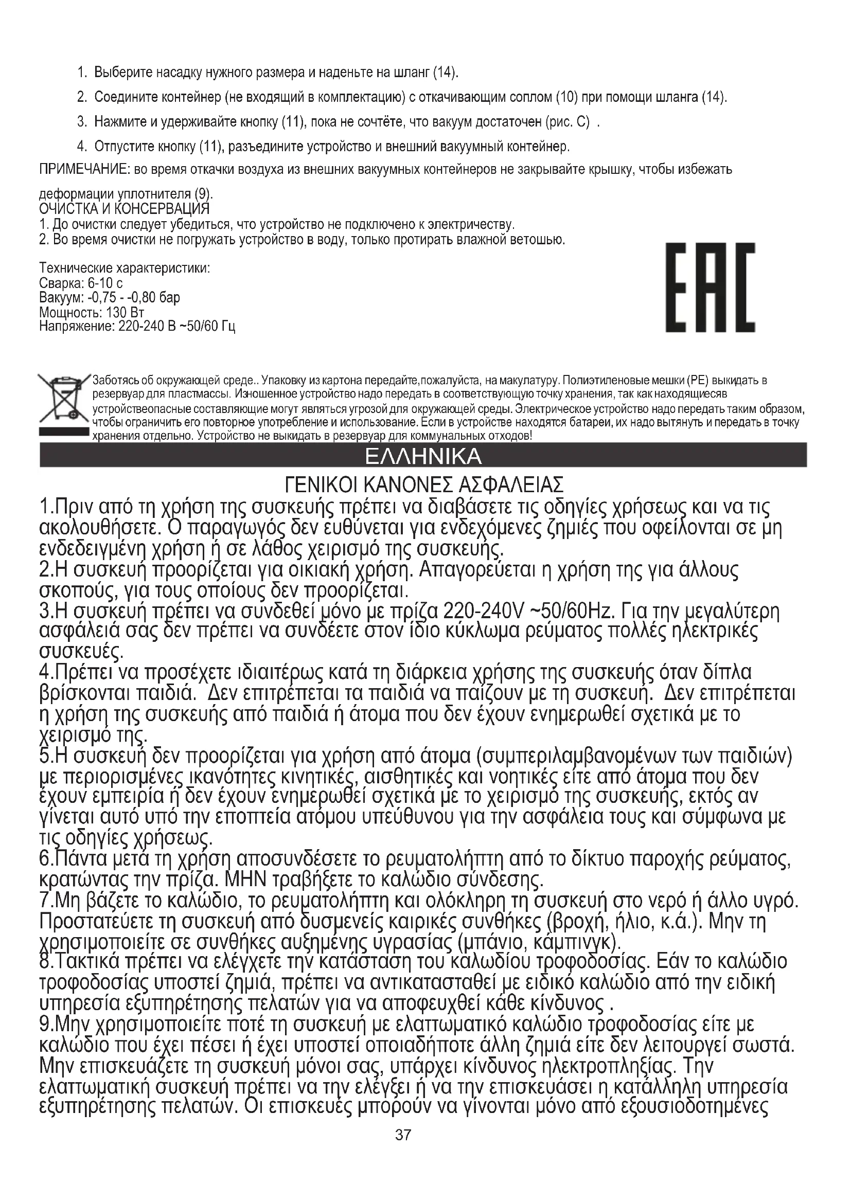 ΠΡΟΣΟΧΗ: κατά την αναρρόφηση του αέρα από εξωτερικά δοχεία κενού μην κλείνετε το κάλυμμα για να αποφύγετε την παραμόρφωση του στεγανοποιητικού (9). ΚΑΘΑΡΙΣΜΟΣ ΚΑΙ ΣΥΝΤΗΡΗΣΗ 1.Πριν από τον καθαρισμό, βεβαιωθείτε οτι η συσκευή δεν είναι συνδεδεμένη σε ηλεκτρικό ρεύμα.