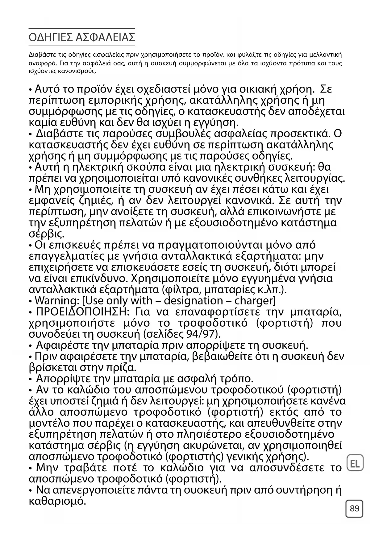 : •89 ΟΔΗΓΙΕΣ ΑΣΦΑΛΕΙΑΣ Διαβάστε τις οδηγίες ασφαλείας πριν χρησιμοποιήσετε το προϊόν, και φυλάξτε τις οδηγίες για μελλοντική αναφορά. Για την ασφάλειά σας, αυτή η συσκευή συμμορφώνεται με όλα τα ισχύοντα πρότυπα και τους ισχύοντες κανονισμούς.