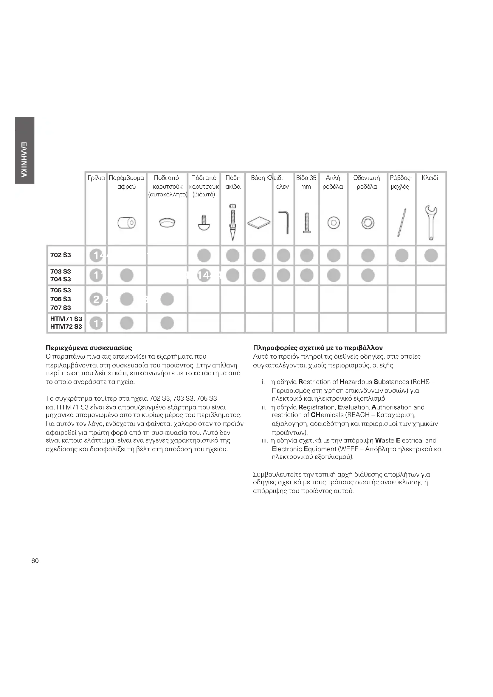 Περιεχόμενα συσκευασίας Ο παραπάνω πίνακας απεικονίζει τα εξαρτήματα που περιλαμβάνονται στη συσκευασία του προϊόντος. Στην απίθανη περίπτωση που λείπει κάτι, επικοινωνήστε με το κατάστημα από το οποίο αγοράσατε τα ηχεία. Το συγκρότημα τουίτερ στα ηχεία 702 S3, 703 S3, 705 S3 και HTM71 S3 είναι ένα αποσυζευγμένο εξάρτημα που είναι μηχανικά απομονωμένο από το κυρίως μέρος του περιβλήματος. Για αυτόν τον λόγο, ενδέχεται να φαίνεται χαλαρό όταν το προϊόν αφαιρεθεί για πρώτη φορά από τη συσκευασία του. Αυτό δεν είναι κάποιο ελάττωμα, είναι ένα εγγενές χαρακτηριστικό της σχεδίασης και διασφαλίζει τη βέλτιστη απόδοση του ηχείου. Πληροφορίες σχετικά με το περιβάλλον Αυτό το προϊόν πληροί τις διεθνείς οδηγίες, στις οποίες συγκαταλέγονται, χωρίς περιορισμούς, οι εξής: