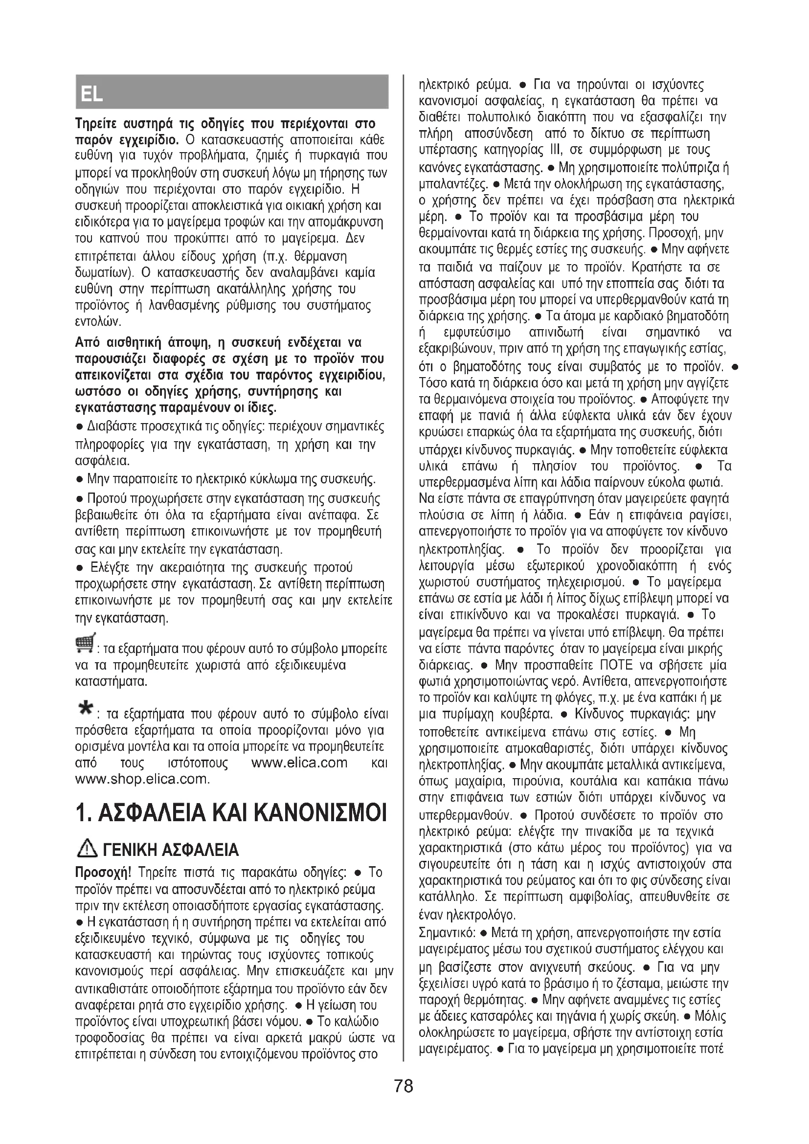 ● Μην παραποιείτε το ηλεκτρικό κύκλωμα της συσκευής. ● Προτού προχωρήσετε στην εγκατάσταση της συσκευής βεβαιωθείτε ότι όλα τα εξαρτήματα είναι ανέπαφα. Σε αντίθετη περίπτωση επικοινωνήστε με τον προμηθευτή σας και μην εκτελείτε την εγκατάσταση. ● Ελέγξτε την ακεραιότητα της συσκευής προτού προχωρήσετε στην εγκατάσταση. Σε αντίθετη περίπτωση επικοινωνήστε με τον προμηθευτή σας και μην εκτελείτε την εγκατάσταση. : τα εξαρτήματα που φέρουν αυτό το σύμβολο μπορείτε να τα προμηθευτείτε χωριστά από εξειδικευμένα καταστήματα. : τα εξαρτήματα που φέρουν αυτό το σύμβολο είναι πρόσθετα εξαρτήματα τα οποία προορίζονται μόνο για ορισμένα μοντέλα και τα οποία μπορείτε να προμηθευτείτε από τους ιστότοπους www.elica.com και www.shop.elica.com.