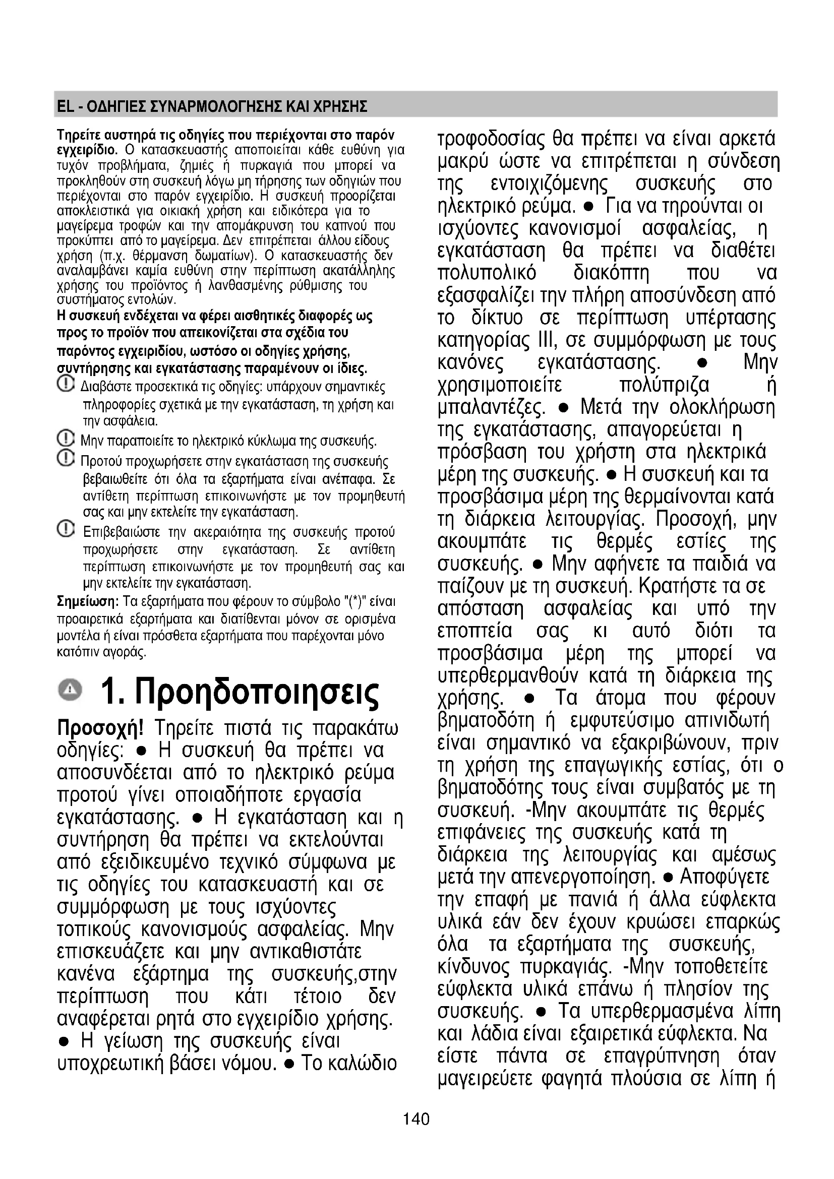Προσοχή! Τηρείτε πιστά τις παρακάτω οδηγίες: ● Η συσκευή θα πρέπει να αποσυνδέεται από το ηλεκτρικό ρεύμα προτού γίνει οποιαδήποτε εργασία εγκατάστασης. ● Η εγκατάσταση και η συντήρηση θα πρέπει να εκτελούνται από εξειδικευμένο τεχνικό σύμφωνα με τις οδηγίες του κατασκευαστή και σε συμμόρφωση με τους ισχύοντες τοπικούς κανονισμούς ασφαλείας. Μην επισκευάζετε και μην αντικαθιστάτε κανένα εξάρτημα της συσκευής,στην περίπτωση που κάτι τέτοιο δεν αναφέρεται ρητά στο εγχειρίδιο χρήσης. ● Η γείωση της συσκευής είναι υποχρεωτική βάσει νόμου. ● Το καλώδιο τροφοδοσίας θα πρέπει να είναι αρκετά μακρύ ώστε να επιτρέπεται η σύνδεση της εντοιχιζόμενης συσκευής στο ηλεκτρικό ρεύμα. ● Για να τηρούνται οι ισχύοντες κανονισμοί ασφαλείας, η εγκατάσταση θα πρέπει να διαθέτει πολυπολικό διακόπτη που να εξασφαλίζει την πλήρη αποσύνδεση από το δίκτυο σε περίπτωση υπέρτασης κατηγορίας III, σε συμμόρφωση με τους κανόνες εγκατάστασης. ● Μην χρησιμοποιείτε πολύπριζα ή μπαλαντέζες. ● Μετά την ολοκλήρωση της εγκατάστασης, απαγορεύεται η πρόσβαση του χρήστη στα ηλεκτρικά μέρη της συσκευής. ● Η συσκευή και τα προσβάσιμα μέρη της θερμαίνονται κατά τη διάρκεια λειτουργίας. Προσοχή, μην ακουμπάτε τις θερμές εστίες της συσκευής. ● Μην αφήνετε τα παιδιά να παίζουν με τη συσκευή. Κρατήστε τα σε απόσταση ασφαλείας και υπό την εποπτεία σας κι αυτό διότι τα προσβάσιμα μέρη της μπορεί να υπερθερμανθούν κατά τη διάρκεια της χρήσης. ● Τα άτομα που φέρουν βηματοδότη ή εμφυτεύσιμο απινιδωτή είναι σημαντικό να εξακριβώνουν, πριν τη χρήση της επαγωγικής εστίας, ότι ο βηματοδότης τους είναι συμβατός με τη συσκευή. -Μην ακουμπάτε τις θερμές επιφάνειες της συσκευής κατά τη διάρκεια της λειτουργίας και αμέσως μετά την απενεργοποίηση. ● Αποφύγετε την επαφή με πανιά ή άλλα εύφλεκτα υλικά εάν δεν έχουν κρυώσει επαρκώς όλα τα εξαρτήματα της συσκευής, κίνδυνος πυρκαγιάς. -Μην τοποθετείτε εύφλεκτα υλικά επάνω ή πλησίον της συσκευής. ● Τα υπερθερμασμένα λίπη και λάδια είναι εξαιρετικά εύφλεκτα. Να είστε πάντα σε επαγρύπνηση όταν μαγειρεύετε φαγητά πλούσια σε λίπη ή141 λάδια. -Στην περίπτωση που εμφανιστούν ρωγμές στην επιφάνεια της συσκευής, απενεργοποιήστε την διότι υπάρχει κίνδυνος ηλεκτροπληξίας. ● Η συσκευή δεν προορίζεται για λειτουργία μέσω εξωτερικού χρονοδιακόπτη ή χωριστού συστήματος τηλεχειρισμού. ● Το μαγείρεμα σε εστία με λάδι ή λίπος δίχως της επίβλεψή σας μπορεί να είναι επικίνδυνο διότι μπορεί να προκληθεί πυρκαγιά. ● Το μαγείρεμα θα πρέπει να εκτελείται υπό την παρουσία σας. Θα πρέπει να είστε πάντα παρόντες όταν το μαγείρεμα είναι μικρής διάρκειας. ● Μην προσπαθήσετε ΠΟΤΕ να σβήσετε μία πυρκαγιά χρησιμοποιώντας νερό. Αντίθετα, θα πρέπει να απενεργοποιήσετε τη συσκευή και εν συνέχεια να καλύψετε τη φωτιά, π.χ. με ένα καπάκι ή μία πυρίμαχη κουβέρτα. Κίνδυνος πυρκαγιάς: μην τοποθετείτε αντικείμενα επάνω στις εστίες. ● Μη χρησιμοποιείτε ατμοκαθαριστές, κίνδυνος ηλεκτροπληξίας. ● Μην ακουμπάτε μεταλλικά αντικείμενα, όπως μαχαίρια, πιρούνια, κουτάλια και καπάκια πάνω στην επιφάνεια της εστίας μαγειρέματος διότι υπάρχει κίνδυνος να υπερθερμανθούν. ● Προτού συνδέσετε τη συσκευή στο ηλεκτρικό δίκτυο: ελέγξτε την πινακίδα στοιχείων (που βρίσκεται στο κάτω μέρος της συσκευής) για να βεβαιωθείτε ότι η τάση και η ισχύς αντιστοιχούν σε εκείνες του δικτύου κ