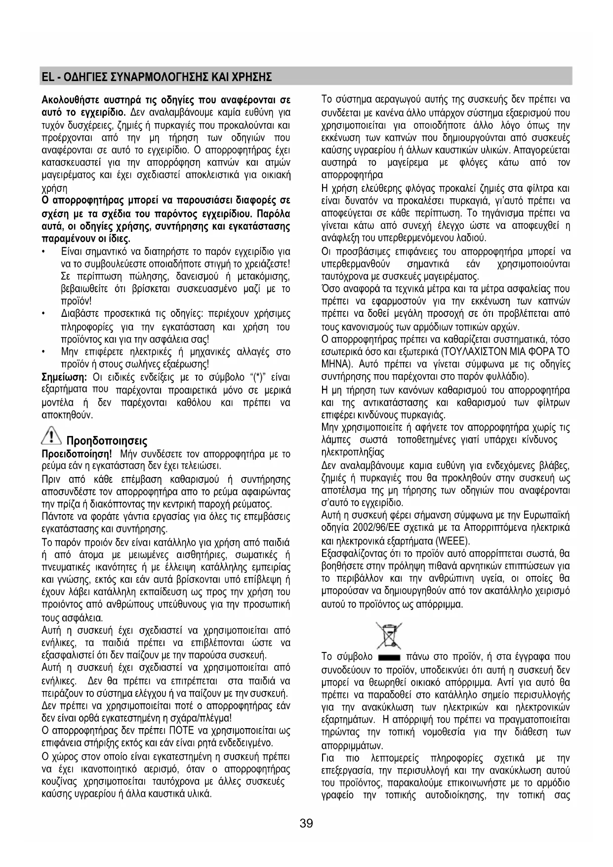όσο και εξωτερικά (ΤΟΥΛΑΧΙΣΤΟΝ ΜΙΑ ΦΟΡΑ ΤΟ ΜΗΝΑ). Αυτό πρέπει να γίνεται σύμφωνα με τις οδηγίες συντήρησης που παρέχονται στο παρόν φυλλάδιο). Η μη τήρηση των κανόνων καθαρισμού του απορροφητήρα και της αντικατάστασης και καθαρισμού των φίλτρων επιφέρει κινδύνους πυρκαγιάς. Μην χρησιμοποιείτε ή αφήνετε τον απορροφητήρα χωρίς τις λάμπες σωστά τοποθετημένες γιατί υπάρχει κίνδυνος ηλεκτροπληξίας Δεν αναλαμβάνουμε καμια ευθύνη για ενδεχόμενες βλάβες, ζημιές ή πυρκαγιές που θα προκληθούν στην συσκευή ως αποτέλσμα της μη τήρησης των οδηγιών που αναφέρονται σ’αυτό το εγχειρίδιο. Αυτή η συσκευή φέρει σήμανση σύμφωνα με την Ευρωπαϊκή οδηγία 2002/96/ΕΕ σχετικά με τα Απορριπτόμενα ηλεκτρικά και ηλεκτρονικά εξαρτήματα (WEEE). Εξασφαλίζοντας ότι το προϊόν αυτό απορρίπτεται σωστά, θα βοηθήσετε στην πρόληψη πιθανά αρνητικών επιπτώσεων για το περιβάλλον και την ανθρώπινη υγεία, οι οποίες θα μπορούσαν να δημιουργηθούν από τον ακατάλληλο χειρισμό αυτού το προϊόντος ως απόρριμμα.