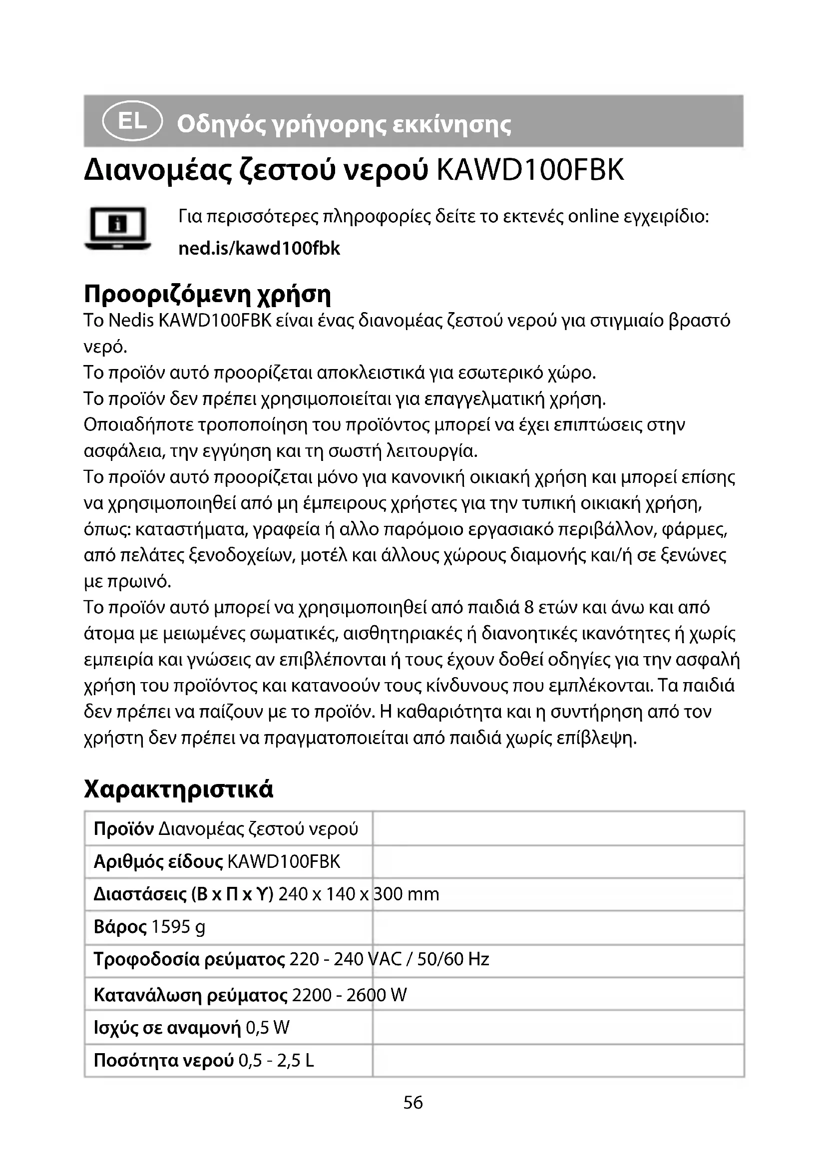 Οδηγός γρήγορης εκκίνησης Διανομέας ζεστού νερού KAWD100FBK Για περισσότερες πληροφορίες δείτε το εκτενές online εγχειρίδιο: ned.is/kawd100fbk Προοριζόμενη χρήση Το Nedis KAWD100FBK είναι ένας διανομέας ζεστού νερού για στιγμιαίο βραστό