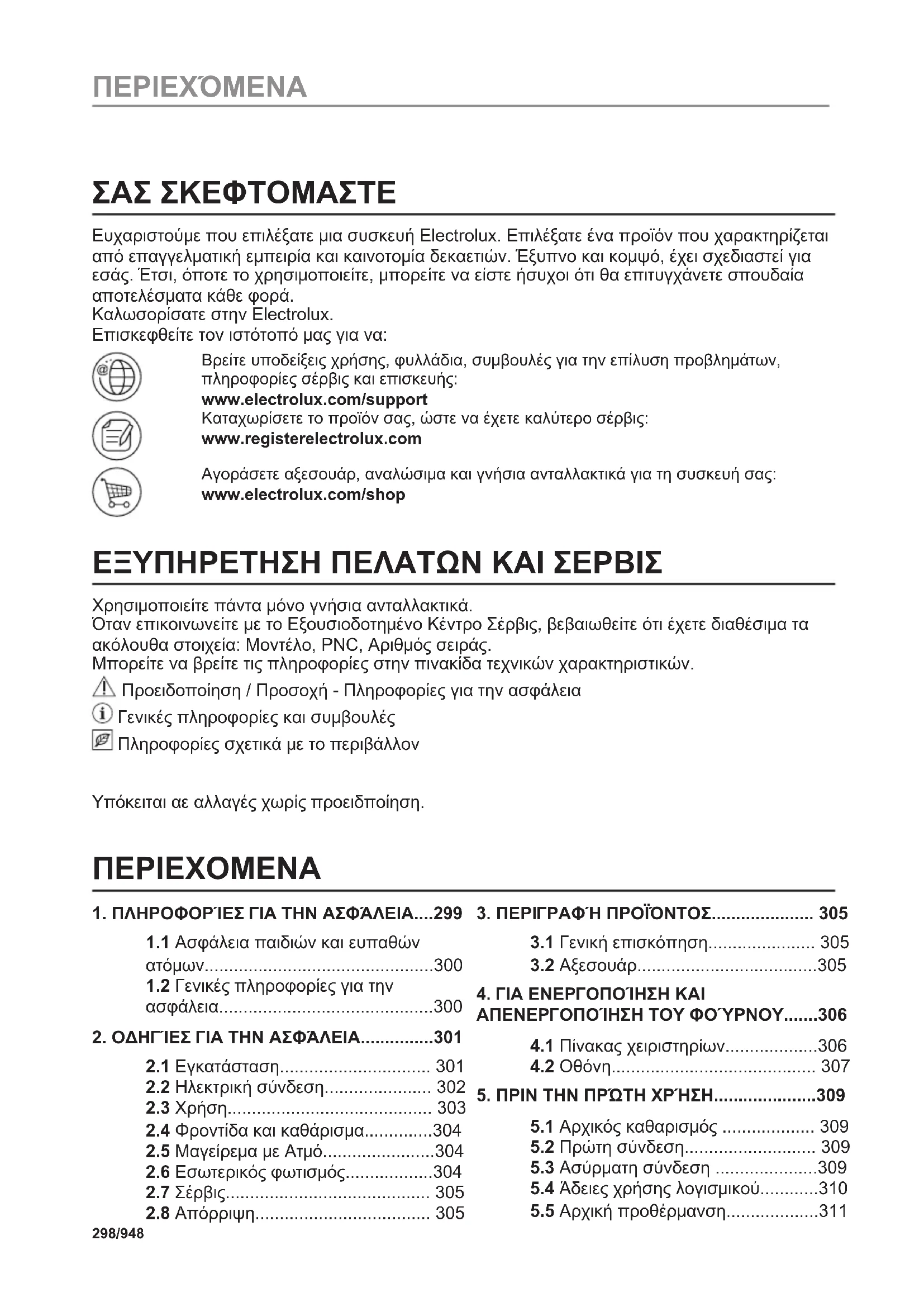 Ευχαριστούμε που επιλέξατε μια συσκευή Electrolux. Επιλέξατε ένα προϊόν που χαρακτηρίζεται από επαγγελματική εμπειρία και καινοτομία δεκαετιών. Έξυπνο και κομψό, έχει σχεδιαστεί για εσάς. Έτσι, όποτε το χρησιμοποιείτε, μπορείτε να είστε ήσυχοι ότι θα επιτυγχάνετε σπουδαία αποτελέσματα κάθε φορά. Καλωσορίσατε στην Electrolux. Επισκεφθείτε τον ιστότοπό μας για να: Βρείτε υποδείξεις χρήσης, φυλλάδια, συμβουλές για την επίλυση προβλημάτων, πληροφορίες σέρβις και επισκευής: www.electrolux.com/support Καταχωρίσετε το προϊόν σας, ώστε να έχετε καλύτερο σέρβις: www.registerelectrolux.com Αγοράσετε αξεσουάρ, αναλώσιμα και γνήσια ανταλλακτικά για τη συσκευή σας: www.electrolux.com/shop ΕΞΥΠΗΡΕΤΗΣΗ ΠΕΛΑΤΩΝ ΚΑΙ ΣΕΡΒΙΣ Χρησιμοποιείτε πάντα μόνο γνήσια ανταλλακτικά. Όταν επικοινωνείτε με το Εξουσιοδοτημένο Κέντρο Σέρβις, βεβαιωθείτε ότι έχετε διαθέσιμα τα ακόλουθα στοιχεία: Μοντέλο, PNC, Αριθμός σειράς. Μπορείτε να βρείτε τις πληροφορίες στην πινακίδα τεχνικών χαρακτηριστικών. Προειδοποίηση / Προσοχή - Πληροφορίες για την ασφάλεια Γενικές πληροφορίες και συμβουλές Πληροφορίες σχετικά με το περιβάλλον Υπόκειται αε αλλαγές χωρίς προειδποίηση. ΠΕΡΙΕΧΟΜΕΝΑ