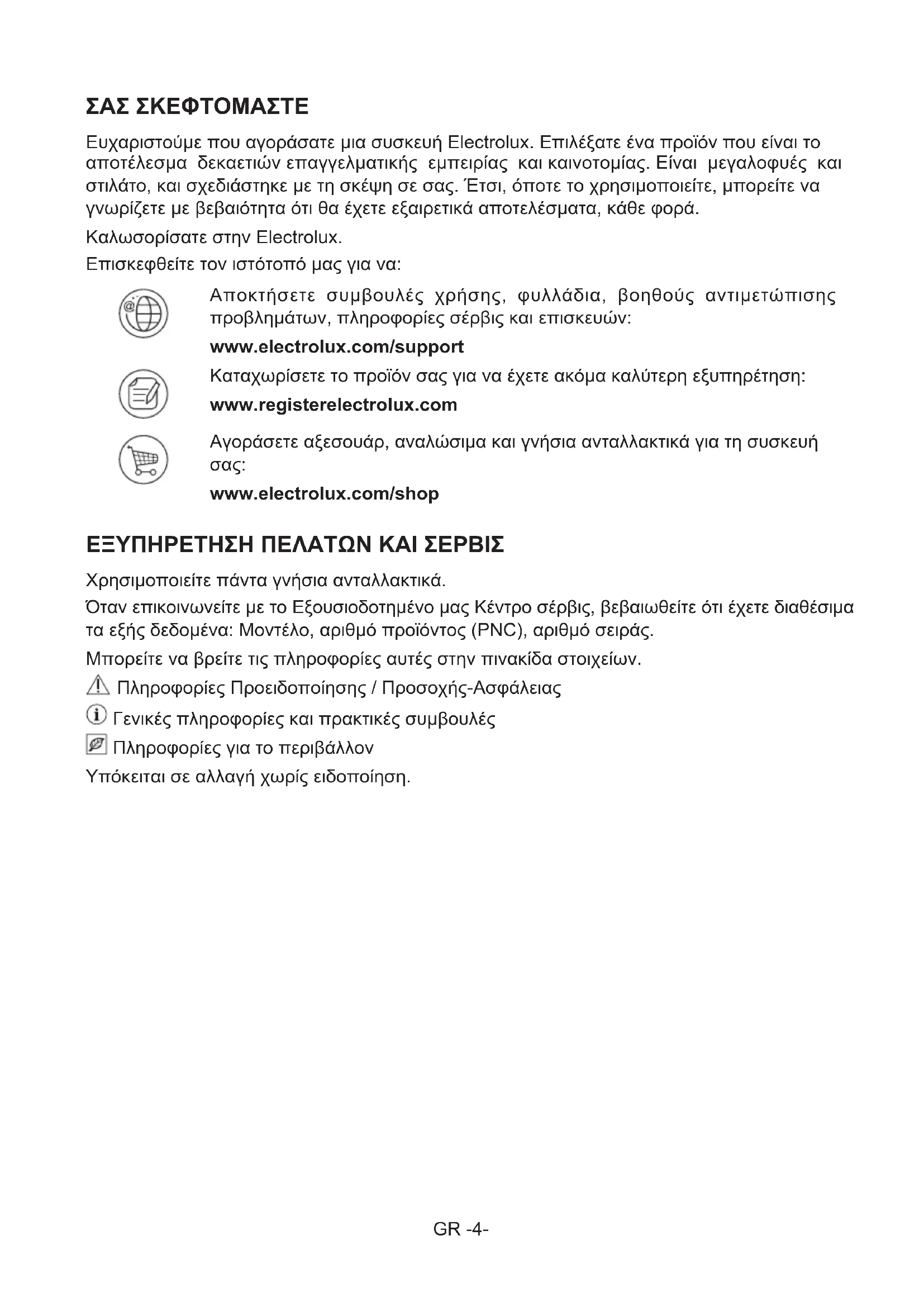 - ΠΛΗΡΟΦΟΡΙΕΣ ΓΙΑ ΙΝΣΤΙΤΟΥΤΑ ΔΟΚΙΜΩΝ GR -4- ΣΑΣ ΣΚΕΦΤΟΜΑΣΤΕ Ευχαριστούμε που αγοράσατε μια συσκευή Electrolux. Επιλέξατε ένα προϊόν που είναι το αποτέλεσμα δεκαετιών επαγγελματικής εμπειρίας και καινοτομίας. Είναι μεγαλοφυές και στιλάτο, και σχεδιάστηκε με τη σκέψη σε σας. Έτσι, όποτε το χρησιμοποιείτε, μπορείτε να γνωρίζετε με βεβαιότητα ότι θα έχετε εξαιρετικά αποτελέσματα, κάθε φορά. Καλωσορίσατε στην Electrolux. Επισκεφθείτε τον ιστότοπό μας για να: Αποκτήσετε συμβουλές χρήσης, φυλλάδια, βοηθούς αντιμετώπισης προβλημάτων, πληροφορίες σέρβις και επισκευών: www.electrolux.com/support Καταχωρίσετε το προϊόν σας για να έχετε ακόμα καλύτερη εξυπηρέτηση: www.registerelectrolux.com Αγοράσετε αξεσουάρ, αναλώσιμα και γνήσια ανταλλακτικά για τη συσκευή p. 34