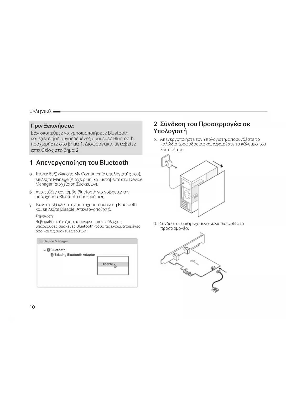 α. Απενεργοποιήστε τον Υπολογιστή, αποσυνδέστε το καλώδιο τροφοδοσίας και αφαιρέστε το κάλυμμα του κουτιού του. β. Συνδέστε το παρεχόμενο καλώδιο USB στο προσαρμογέα. 1 Απενεργοποίηση του Bluetooth α. Κάντε δεξί κλικ στο My Computer (ο υπολογιστής μου), επιλέξτε Manage (Διαχείριση) και μεταβείτε στο Device Manager (Διαχείριση Συσκευών). β. Αναπτύξτε τονκόμβο Bluetooth για ναβρείτε την υπάρχουσα Bluetooth συσκευή σας. γ. Κάντε δεξί κλικ στην υπάρχουσα συσκευή Bluetooth και επιλέξτε Disable (Απενεργοποίηση).