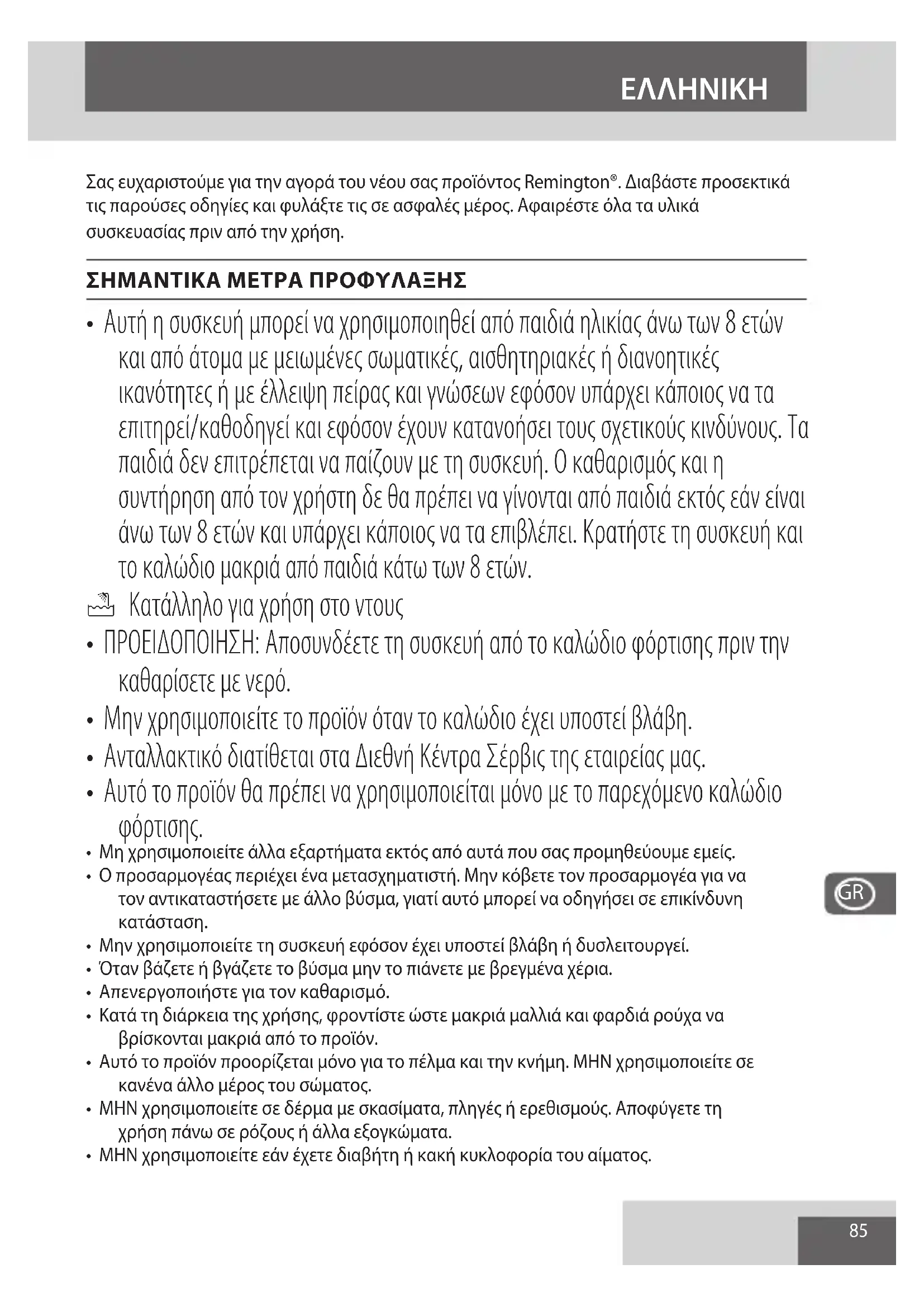 Για την αποφυγή προβλημάτων στο περιβάλλον και την υγεία λόγω επιβλαβών ουσιών, οι συσκευές και οι επαναφορτιζόμενες και μη επαναφορτιζόμενες μπαταρίες που επισημαίνονται με κάποιο από αυτά τα σύμβολα, δεν πρέπει να απορρίπτονται με τα κοινά οικιακά απορρίμματα. Να απορρίπτετε πάντα τις ηλεκτρικές και ηλεκτρονικές συσκευές και, όπου χρειάζεται, τις επαναφορτιζόμενες και μη επαναφορτιζόμενες μπαταρίες, σε κατάλληλο, επίσημο σημείο συλλογής/ανακύκλωσης. EΛΛHNIKH90 Zahvaljujemo se vam za nakup novega izdelka Remington®. Prosimo, da skrbno preberete ta navodila in jih varno shranite. Pred uporabo odstranite vso embalažo. OPOZORILO: Ta naprava je vroča. Vedno naj bo nedosegljiva otrokom.