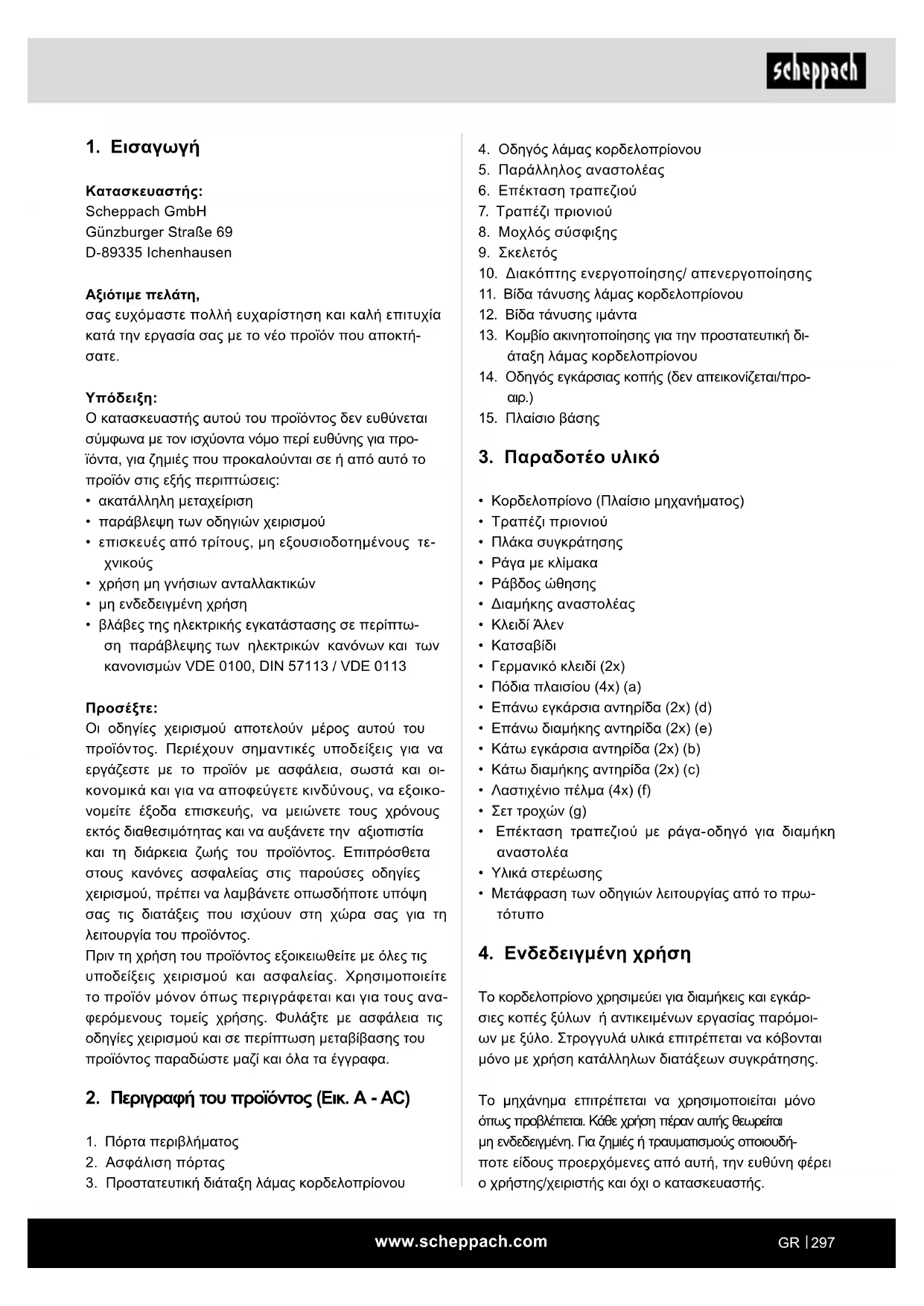 Κατασκευαστής: Scheppach GmbH Günzburger Straße 69 D-89335 Ichenhausen Αξιότιμε πελάτη, σας ευχόμαστε πολλή ευχαρίστηση και καλή επιτυχία κατά την εργασία σας με το νέο προϊόν που αποκτή-