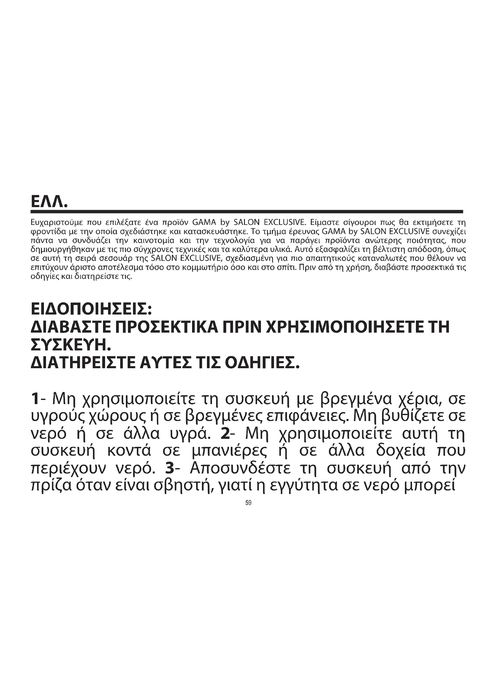 Ευχαριστούμε που επιλέξατε ένα προϊόν GAMA by SALON EXCLUSIVE. Είμαστε σίγουροι πως θα εκτιμήσετε τη φροντίδα με την οποία σχεδιάστηκε και κατασκευάστηκε. Το τμήμα έρευνας GAMA by SALON EXCLUSIVE συνεχίζει πάντα να συνδυάζει την καινοτομία και την τεχνολογία για να παράγει προϊόντα ανώτερης ποιότητας, που δημιουργήθηκαν με τις πιο σύγχρονες τεχνικές και τα καλύτερα υλικά. Αυτό εξασφαλίζει τη βέλτιστη απόδοση, όπως σε αυτή τη σειρά σεσουάρ της SALON EXCLUSIVE, σχεδιασμένη για πιο απαιτητικούς καταναλωτές που θέλουν να επιτύχουν άριστο αποτέλεσμα τόσο στο κομμωτήριο όσο και στο σπίτι. Πριν από τη χρήση, διαβάστε προσεκτικά τις οδηγίες και διατηρείστε τις. ΕΙΔΟΠΟΙΗΣΕΙΣ: ΔΙΑΒΑΣΤΕ ΠΡΟΣΕΚΤΙΚΑ ΠΡΙΝ ΧΡΗΣΙΜΟΠΟΙΗΣΕΤΕ ΤΗ