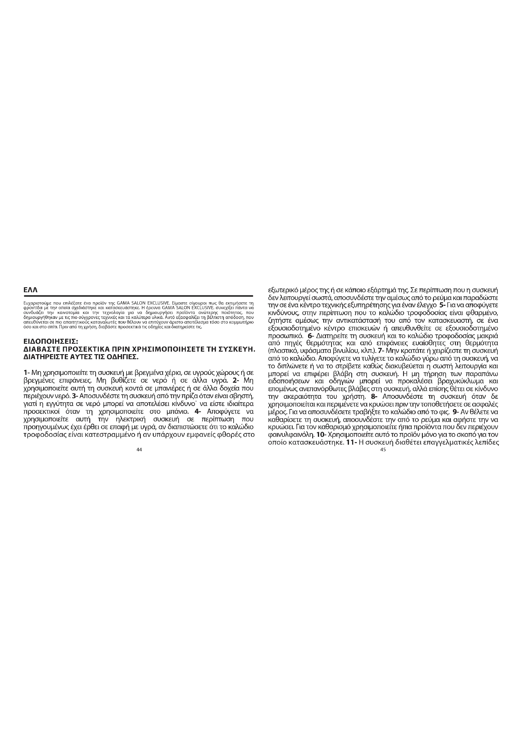 Nous vous remercions d'avoir acheté un produit GAMA BY GAMA SALON EXCLUSIVE. Nous sommes certains que vous apprécierez le soin avec lequel il a été conçu et fabriqué. La recherche GAMA Toulouse conjugue innovation et technologie en vue de proposer des produits de très haute qualité, réalisés avec les techniques les plus modernes et les meilleurs matériaux. Cela garantit les meilleures performances, étudiées pour les utilisateurs les plus exigeants qui désirent obtenir un résultat exceptionnel. Avant l'utilisation, lire attentivement le mode d'emploi et le conserver.