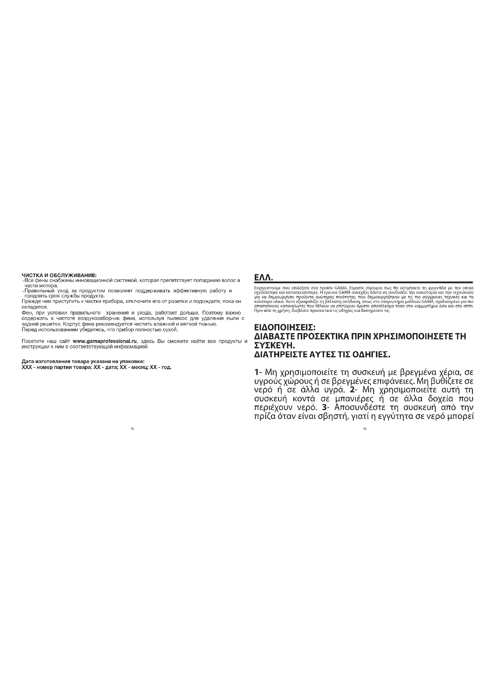 54ΕΛΛ. Ευχαριστούμε που επιλέξατε ένα προϊόν GAMA. Είμαστε σίγουροι πως θα εκτιμήσετε τη φροντίδα με την οποία σχεδιάστηκε και κατασκευάστηκε. Η έρευνα GAMA συνεχίζει πάντα να συνδυάζει την καινοτομία και την τεχνολογία για να δημιουργήσει προϊόντα ανώτερης ποιότητας, που δημιουργήθηκαν με τις πιο σύγχρονες τεχνικές και τα καλύτερα υλικά. Αυτό εξασφαλίζει τη βέλτιστη απόδοση, όπως στο στεγνωτήρα μαλλιών GAMA, σχεδιασμένο για πιο απαιτητικούς καταναλωτές που θέλουν να επιτύχουν άριστο αποτέλεσμα τόσο στο κομμωτήριο όσο και στο σπίτι. Πριν από τη χρήση, διαβάστε προσεκτικά τις οδηγίες και διατηρείστε τις. ΕΙΔΟΠΟΙΗΣΕΙΣ: ΔΙΑΒΑΣΤΕ ΠΡΟΣΕΚΤΙΚΑ ΠΡΙΝ ΧΡΗΣΙΜΟΠΟΙΗΣΕΤΕ ΤΗ