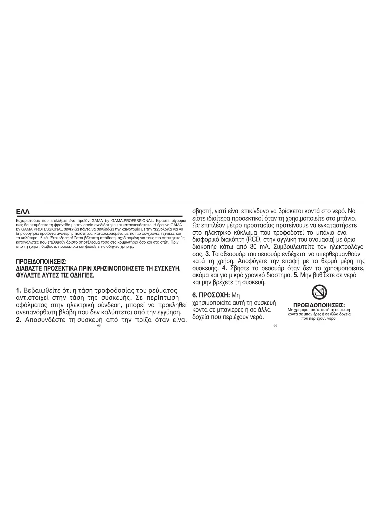Используйте только оригинальные принадлежности для профессиональных инструментов бренда GAMA.ΕΛΛ Ευχαριστούμε που επιλέξατε ένα προϊόν GAMA by GAMA.PROFESSIONAL. Είμαστε σίγουροι πως θα εκτιμήσετε τη φροντίδα με την οποία σχεδιάστηκε και κατασκευάστηκε. Η έρευνα GAMA by GAMA.PROFESSIONAL συνεχίζει πάντα να συνδυάζει την καινοτομία με την τεχνολογία για να δημιουργήσει προϊόντα ανώτερης ποιότητας, κατασκευασμένα με τις πιο σύγχρονες τεχνικές και τα καλύτερα υλικά. Έτσι εξασφαλίζεται βέλτιστη απόδοση, σχεδιασμένη για τους πιο απαιτητικούς καταναλωτές που επιθυμούν άριστο αποτέλεσμα τόσο στο κομμωτήριο όσο και στο σπίτι. Πριν από τη χρήση, διαβάστε προσεκτικά και φυλάξτε τις οδηγίες χρήσης. ΠΡΟΕΙΔΟΠΟΙΗΣΕΙΣ: ΔΙΑΒΑΣΤΕ ΠΡΟΣΕΚΤΙΚΑ ΠΡΙΝ ΧΡΗΣΙΜΟΠΟΙΗΣΕΤΕ ΤΗ ΣΥΣΚΕΥΗ. ΦΥΛΑΞΤΕ ΑΥΤΕΣ ΤΙΣ ΟΔΗΓΙΕΣ.