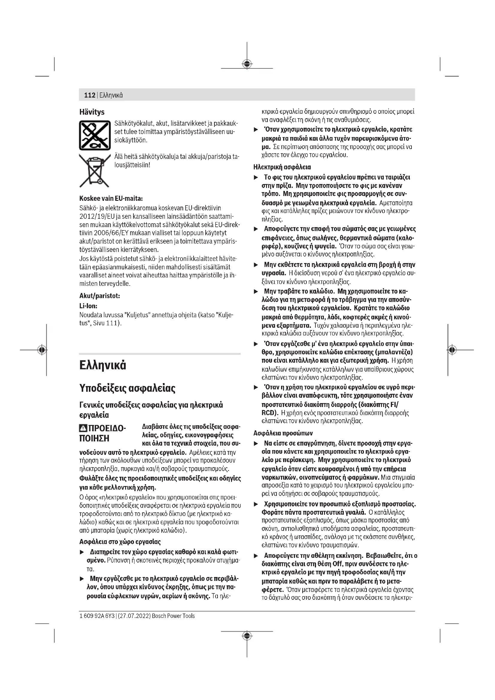 u Χρησιμοποιείτε τα ηλεκτρικά εργαλεία μόνο με τις ειδι- κά σχεδιασμένες μπαταρίες. Η χρήση άλλων μπαταριών μπορεί να οδηγήσει σε τραυματισμούς και να δημιουργήσει κίνδυνο πυρκαγιάς. u Όταν η μπαταρία δε χρησιμοποιείται, κρατήστε την μα- κριά από άλλα μεταλλικά αντικείμενα, όπως συνδετή- ρες χαρτιών, νομίσματα, κλειδιά, καρφιά, βίδες ή άλλα μικρά μεταλλικά αντικείμενα που μπορούν να βραχυκυ- κλώσουν τις επαφές της μπαταρίας. Ένα βραχυκύκλωμα των επαφών της μπαταρίας μπορεί να προκαλέσει τραυματι- σμούς ή φωτιά. u Μια τυχόν εσφαλμένη χρήση μπορεί να οδηγήσει σε διαρροή υγρών από την μπαταρία. Αποφεύγετε κάθε επαφή μ’ αυτά. Σε περίπτωση τυχαίας επαφής ξεπλύνε- τε καλά με νερό. Εάν τα υγρά έρθουν σε επαφή με τα μάτια, ζητήστε επιπλέον ιατρική βοήθεια. Διαρρέοντα υγρά μπαταρίας μπορεί να οδηγήσουν σε ερεθισμούς του δέρματος ή σε εγκαύματα. u Μην χρησιμοποιείτε μπαταρία ή εργαλείο που είναι κα- τεστραμμένο ή τροποποιημένο. Οι χαλασμένες ή τροπο- ποιημένες μπαταρίες μπορεί να παρουσιάσουν μια απρόβλεπτη συμπεριφορά και να οδηγήσουν σε φωτιά, έκρηξη ή σε κίνδυνο τραυματισμού. u Μην εκθέτετε μια μπαταρία ή ένα εργαλείο μπαταρίας σε φωτιά ή σε πολύ υψηλές θερμοκρασίες. Η έκθεση στη φωτιά ή σε θερμοκρασία πάνω από τους 130 °C μπορεί να προκαλέσει έκρηξη. u Τηρείτε όλες τις υποδείξεις για τη φόρτιση και μη φορ- τίζετε την μπαταρία ή το εργαλείο μπαταρίας ποτέ εκτός της περιοχής θερμοκρασίας που αναφέρεται στις οδηγίες λειτουργίας. Η λάθος φόρτιση ή η φόρτιση εκτός της επιτρεπτής περιοχής θερμοκρασίας μπορεί να κατα- Bosch Power Tools 1 609 92A 6Y3 | (27.07.2022)114 | Ελληνικά στρέψει την μπαταρία και να αυξήσει τον κίνδυνο πυρκα-