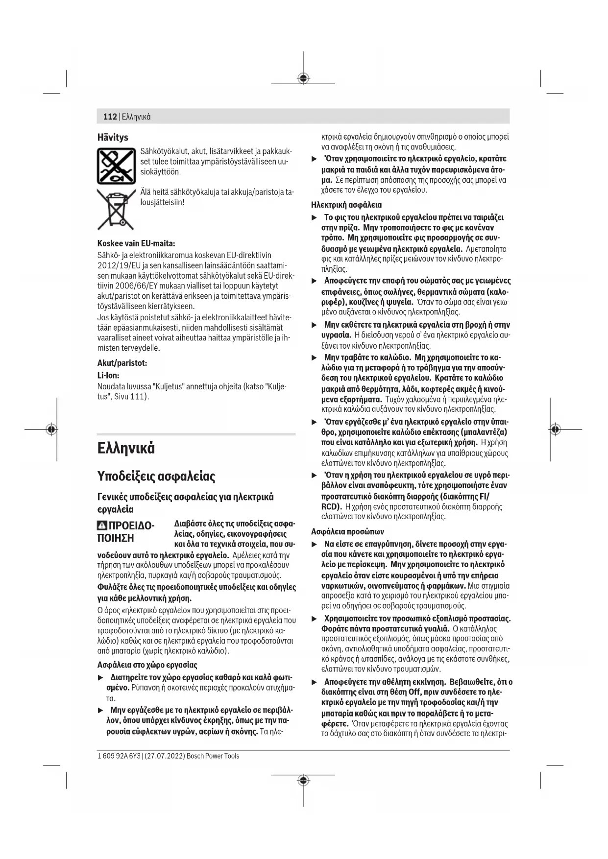 Περιγραφή προϊόντος και ισχύος Διαβάστε όλες τις υποδείξεις ασφαλείας και τις οδηγίες. Η μη τήρηση των υποδείξεων ασφαλείας και των οδηγιών μπορεί να προκα- λέσει ηλεκτροπληξία, πυρκαγιά και/ή σοβαρούς τραυματισμούς. 1 609 92A 6Y3 | (27.07.2022) Bosch Power ToolsΕλληνικά | 115 Προσέξτε παρακαλώ τις εικόνες στο μπροστινό μέρος των οδη- γιών λειτουργίας. Χρήση σύμφωνα με τον προορισμό Το ηλεκτρικό εργαλείο προορίζεται, σε περίπτωση σταθερής επιφάνειας στήριξης, για την κοπή ξύλου, συνθετικού υλικού, μετάλλου, κεραμικών πλακών, λάστιχου και λαμινάτ/HPL (πο- λυστρωματικό υλικό υψηλής πίεσης). Είναι κατάλληλη για ευ- θείες και κυκλικές κοπές. Προσέχετε τις συστάσεις για τις πριο-