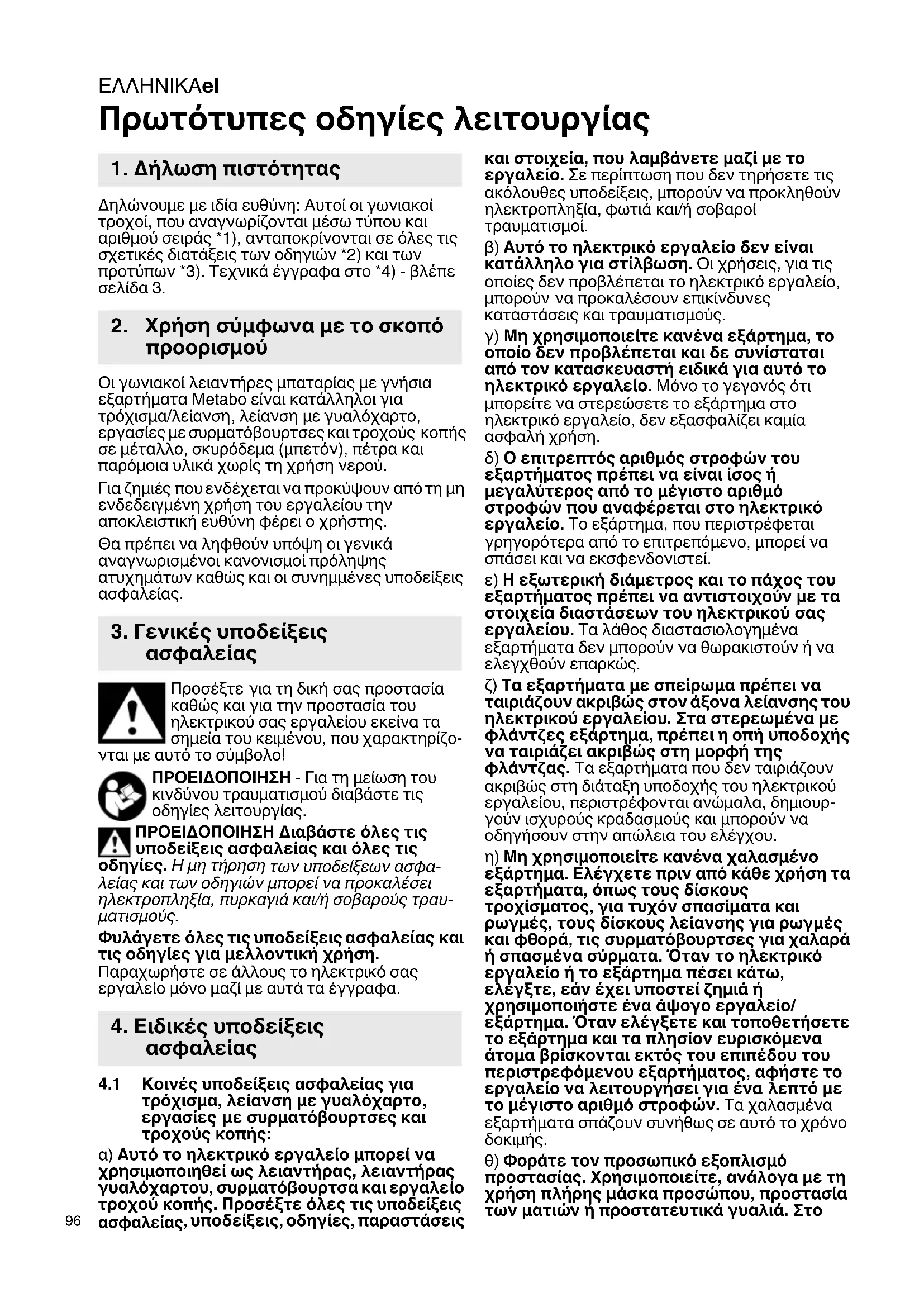 Πρωτότυπες οδηγίες λειτουργίας Δηλώνουμε με ιδία ευθύνη: Αυτοί οι γωνιακοί τροχοί, που αναγνωρίζονται μέσω τύπου και αριθμού σειράς *1), ανταποκρίνονται σε όλες τις σχετικές διατάξεις των οδηγιών *2) και των προτύπων *3). Τεχνικά έγγραφα στο *4) - βλέπε σελίδα 3. Οι γωνιακοί λειαντήρες μπαταρίας με γνήσια εξαρτήματα Metabo είναι κατάλληλοι για τρόχισμα/λείανση, λείανση με γυαλόχαρτο, εργασίες με συρματόβουρτσες και τροχούς