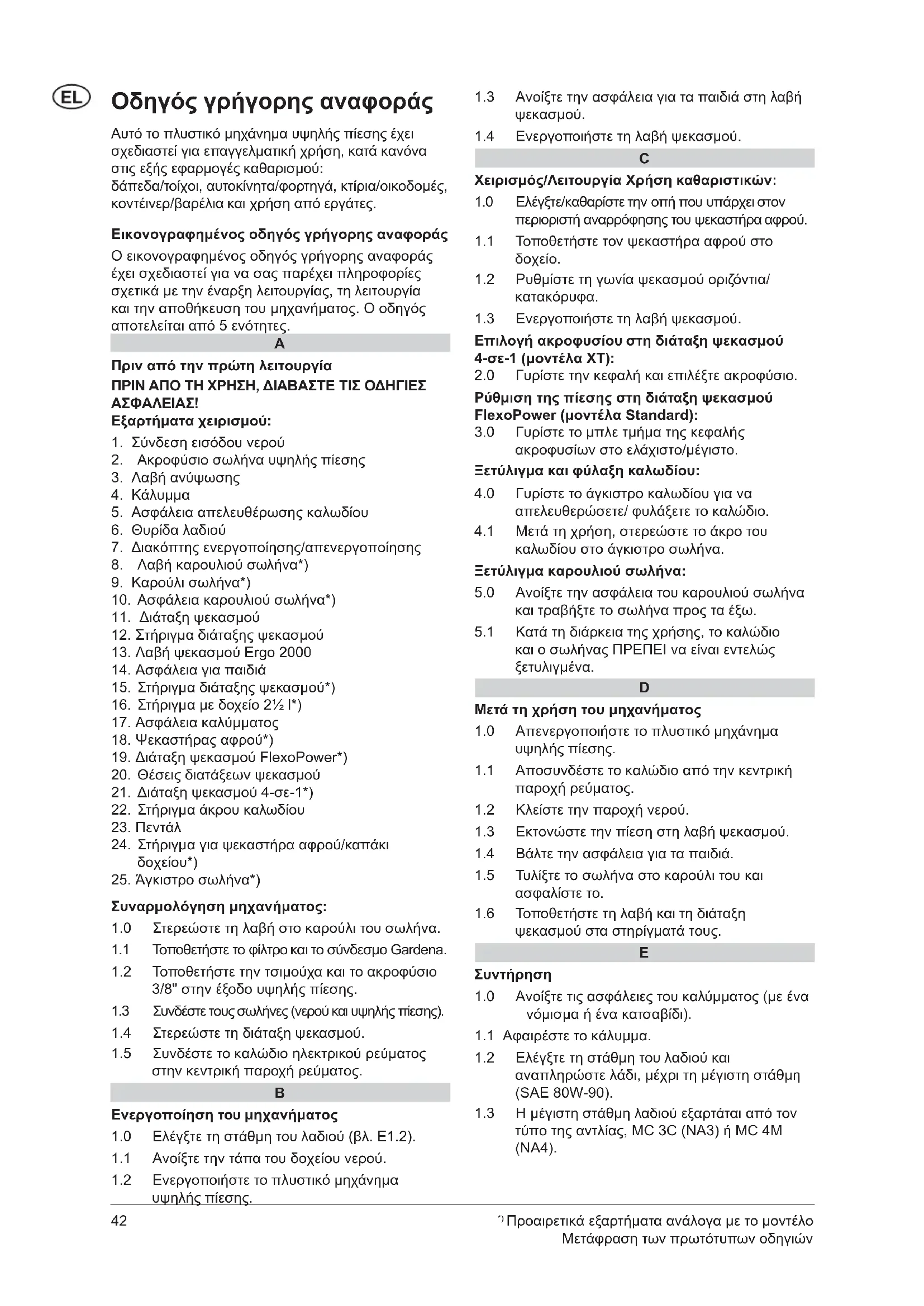Οδηγός γρήγορης αναφοράς Αυτό το πλυστικό μηχάνημα υψηλής πίεσης έχει σχεδιαστεί για επαγγελματική χρήση, κατά κανόνα στις εξής εφαρμογές καθαρισμού: δάπεδα/τοίχοι, αυτοκίνητα/φορτηγά, κτίρια/οικοδομές, κοντέινερ/βαρέλια και χρήση από εργάτες. Εικονογραφημένος οδηγός γρήγορης αναφοράς Ο εικονογραφημένος οδηγός γρήγορης αναφοράς έχει σχεδιαστεί για να σας παρέχει πληροφορίες σχετικά με την έναρξη λειτουργίας, τη