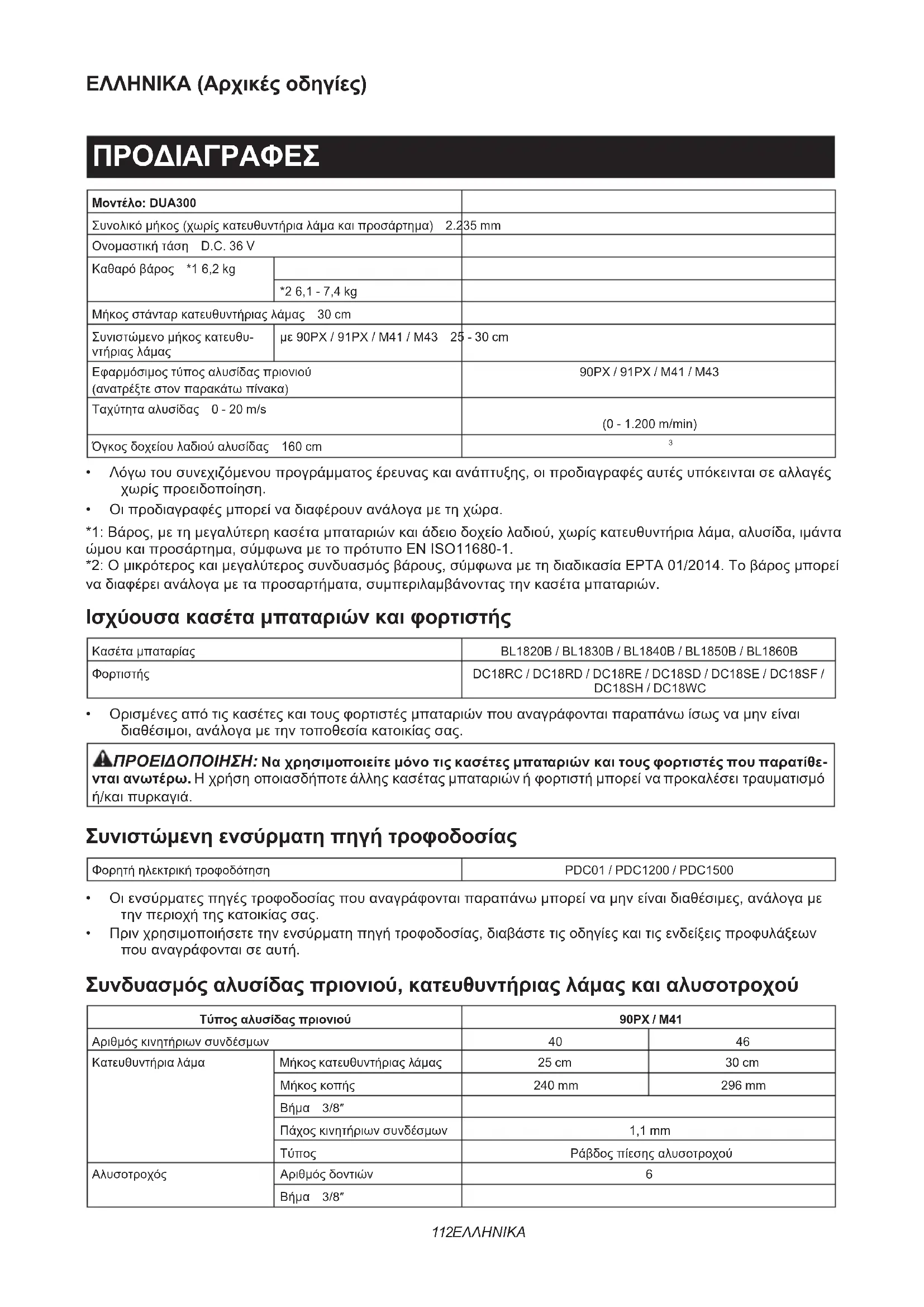 - Οιπροδιαγραφέςμπορείναδιαφέρουνανάλογαμετηχώρα. *1:Βάρος,μετημεγαλύτερηκασέταμπαταριώνκαιάδειοδοχείολαδιού,χωρίςκατευθυντήριαλάμα,αλυσίδα,ιμάντα ώμουκαιπροσάρτημα,σύμφωναμετοπρότυποENISO11680-1. *2:Ομικρότεροςκαιμεγαλύτεροςσυνδυασμόςβάρους,σύμφωναμετηδιαδικασίαEPTA01/2014.Τοβάροςμπορεί ναδιαφέρειανάλογαμεταπροσαρτήματα,συμπεριλαμβάνονταςτηνκασέταμπαταριών. Ισχύουσα κασέτα μπαταριών και φορτιστής Κασέταμπαταρίας BL1820B / BL1830B / BL1840B / BL1850B / BL1860B Φορτιστής DC18RC / DC18RD / DC18RE / DC18SD / DC18SE / DC18SF / DC18SH / DC18WC