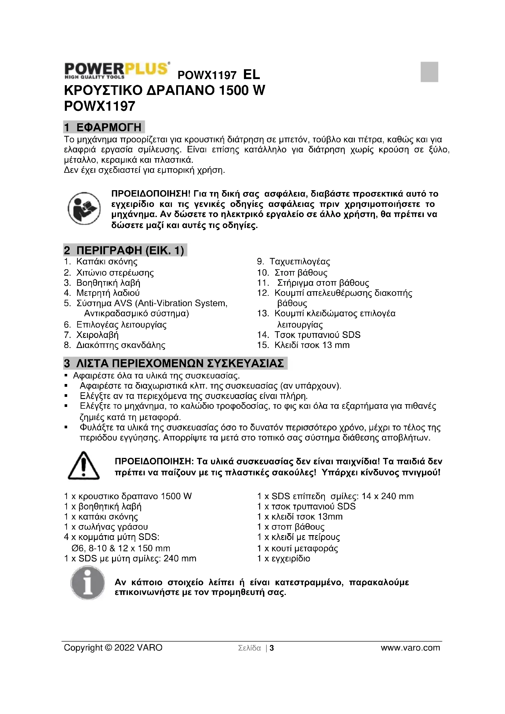 H VARO N.V. - Vic. Van Rompuy N.V. - Joseph Van Instraat 9 - BE2500 Lier - BELGIUM, έηλώνει ὄτι Κάτωθι προίσν: Kρουσικό δράπανο εμπορικό σήμα: POWERplus μοντέλο: POWX1197