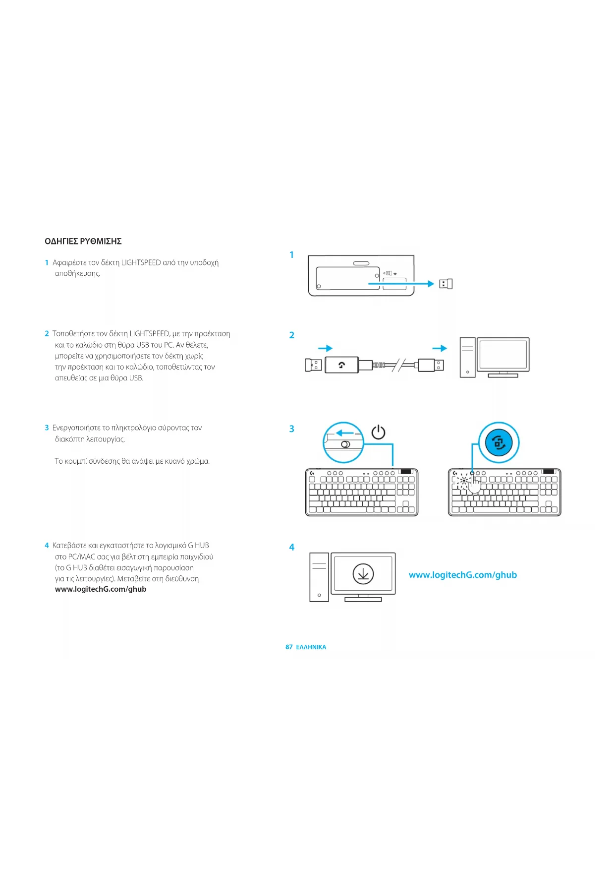 -yhteyden kohdalla sinisenä.87 ΕΛΛΗΝΙΚΆ ΟΔΗΓΙΕΣ ΡΥΘΜΙΣΗΣ 1 Αφαιρέστε τον δέκτη LIGHTSPEED από την υποδοχή αποθήκευσης. 2 Τοποθετήστε τον δέκτη LIGHTSPEED, με την προέκταση και το καλώδιο στη θύρα USB του PC. Αν θέλετε, μπορείτε να χρησιμοποιήσετε τον δέκτη χωρίς την προέκταση και το καλώδιο, τοποθετώντας τον απευθείας σε μια θύρα USB. 3 Ενεργοποιήστε το πληκτρολόγιο σύροντας τον διακόπτηλειτουργίας. Το κουμπί σύνδεσης θα ανάψει με κυανό χρώμα. 4 Κατεβάστε και εγκαταστήστε το λογισμικό G HUB στο PC/MAC σας για βέλτιστη εμπειρία παιχνιδιού (το G HUB διαθέτει εισαγωγική παρουσίαση για τις λειτουργίες). Μεταβείτε στη διεύθυνση www.logitechG.com/ghub