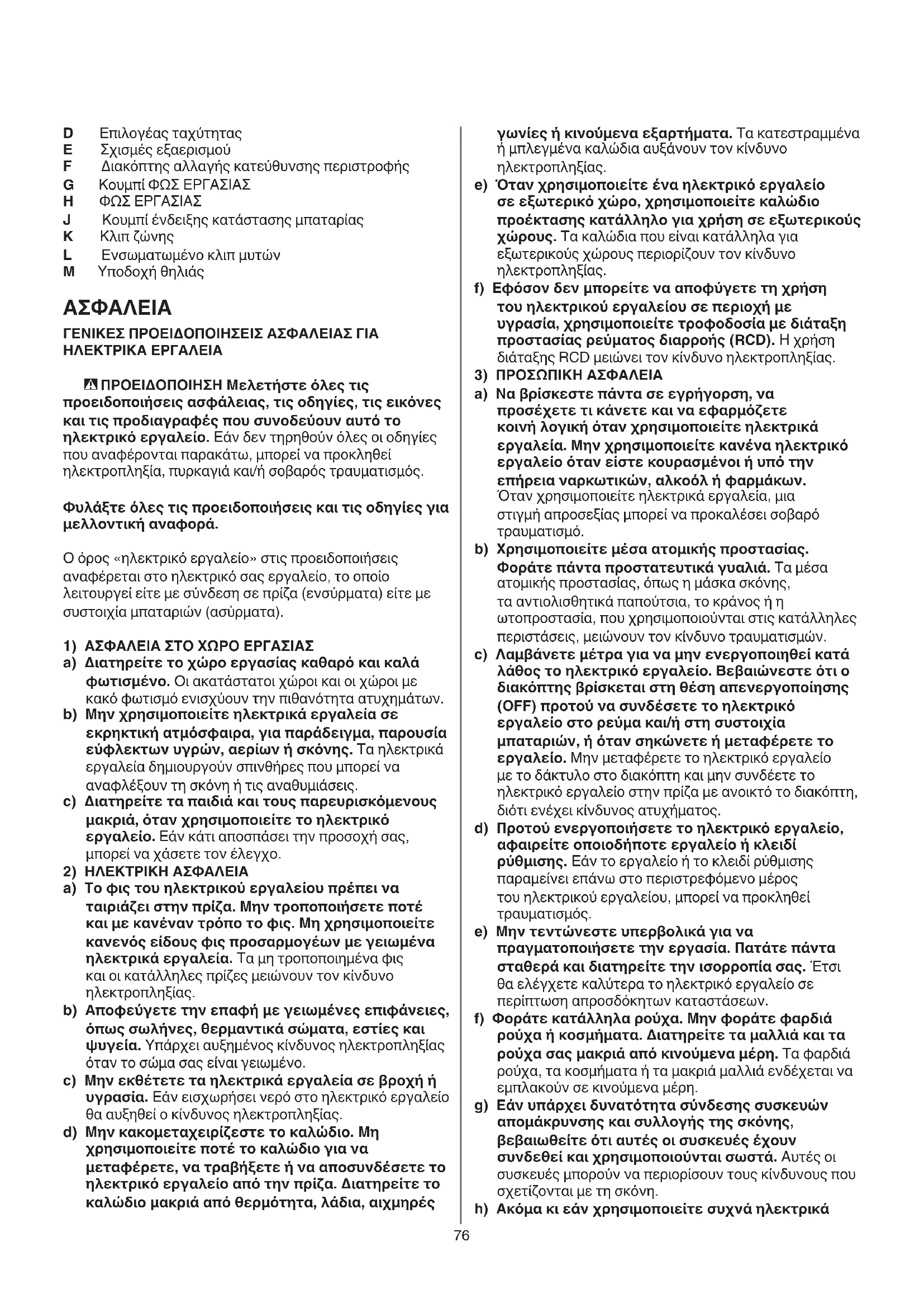 a) Να βρίσκεστε πάντα σε εγρήγορση, να προσέχετε τι κάνετε και να εφαρμόζετε κοινή λογική όταν χρησιμοποιείτε ηλεκτρικά εργαλεία. Μην χρησιμοποιείτε κανένα ηλεκτρικό εργαλείο όταν είστε κουρασμένοι ή υπό την επήρεια ναρκωτικών, αλκοόλ ή φαρμάκων. Όταν χρησιμοποιείτε ηλεκτρικά εργαλεία, μια στιγμή απροσεξίας μπορεί να προκαλέσει σοβαρό τραυματισμό. b) Χρησιμοποιείτε μέσα ατομικής προστασίας. Φοράτε πάντα προστατευτικά γυαλιά. Τα μέσα ατομικής προστασίας, όπως η μάσκα σκόνης, τα αντιολισθητικά παπούτσια, το κράνος ή η ωτοπροστασία, που χρησιμοποιούνται στις κατάλληλες περιστάσεις, μειώνουν τον κίνδυνο τραυματισμών. c) Λαμβάνετε μέτρα για να μην ενεργοποιηθεί κατά λάθος το ηλεκτρικό εργαλείο. Βεβαιώνεστε ότι ο διακόπτης βρίσκεται στη θέση απενεργοποίησης (OFF) προτού να συνδέσετε το ηλεκτρικό εργαλείο στο ρεύμα και/ή στη συστοιχία μπαταριών, ή όταν σηκώνετε ή μεταφέρετε το εργαλείο. Μην μεταφέρετε το ηλεκτρικό εργαλείο με το δάκτυλο στο διακόπτη και μην συνδέετε το ηλεκτρικό εργαλείο στην πρίζα με ανοικτό το διακόπτη, διότι ενέχει κίνδυνος ατυχήματος. d) Προτού ενεργοποιήσετε το ηλεκτρικό εργαλείο, αφαιρείτε οποιοδήποτε εργαλείο ή κλειδί ρύθμισης. Εάν το εργαλείο ή το κλειδί ρύθμισης παραμείνει επάνω στο περιστρεφόμενο μέρος του ηλεκτρικού εργαλείου, μπορεί να προκληθεί τραυματισμός. e) Μην τεντώνεστε υπερβολικά για να πραγματοποιήσετε την εργασία. Πατάτε πάντα σταθερά και διατηρείτε την ισορροπία σας. Έτσι θα ελέγχετε καλύτερα το ηλεκτρικό εργαλείο σε περίπτωση απροσδόκητων καταστάσεων. f) Φοράτε κατάλληλα ρούχα. Μην φοράτε φαρδιά ρούχα ή κοσμήματα. Διατηρείτε τα μαλλιά και τα ρούχα σας μακριά από κινούμενα μέρη. Τα φαρδιά ρούχα, τα κοσμήματα ή τα μακριά μαλλιά ενδέχεται να εμπλακούν σε κινούμενα μέρη. g) Εάν υπάρχει δυνατότητα σύνδεσης συσκευών απομάκρυνσης και συλλογής της σκόνης, βεβαιωθείτε ότι αυτές οι συσκευές έχουν συνδεθεί και χρησιμοποιούνται σωστά. Αυτές οι συσκευές μπορούν να περιορίσουν τους κίνδυνους που σχετίζονται με τη σκόνη. h) Ακόμα κι εάν χρησιμοποιείτε συχνά ηλεκτρικά D Επιλογέας ταχύτητας E Σχισμές εξαερισμού F Διακόπτης αλλαγής κατεύθυνσης περιστροφής G Κουμπί ΦΩΣ ΕΡΓΑΣΙΑΣ H ΦΩΣ ΕΡΓΑΣΙΑΣ