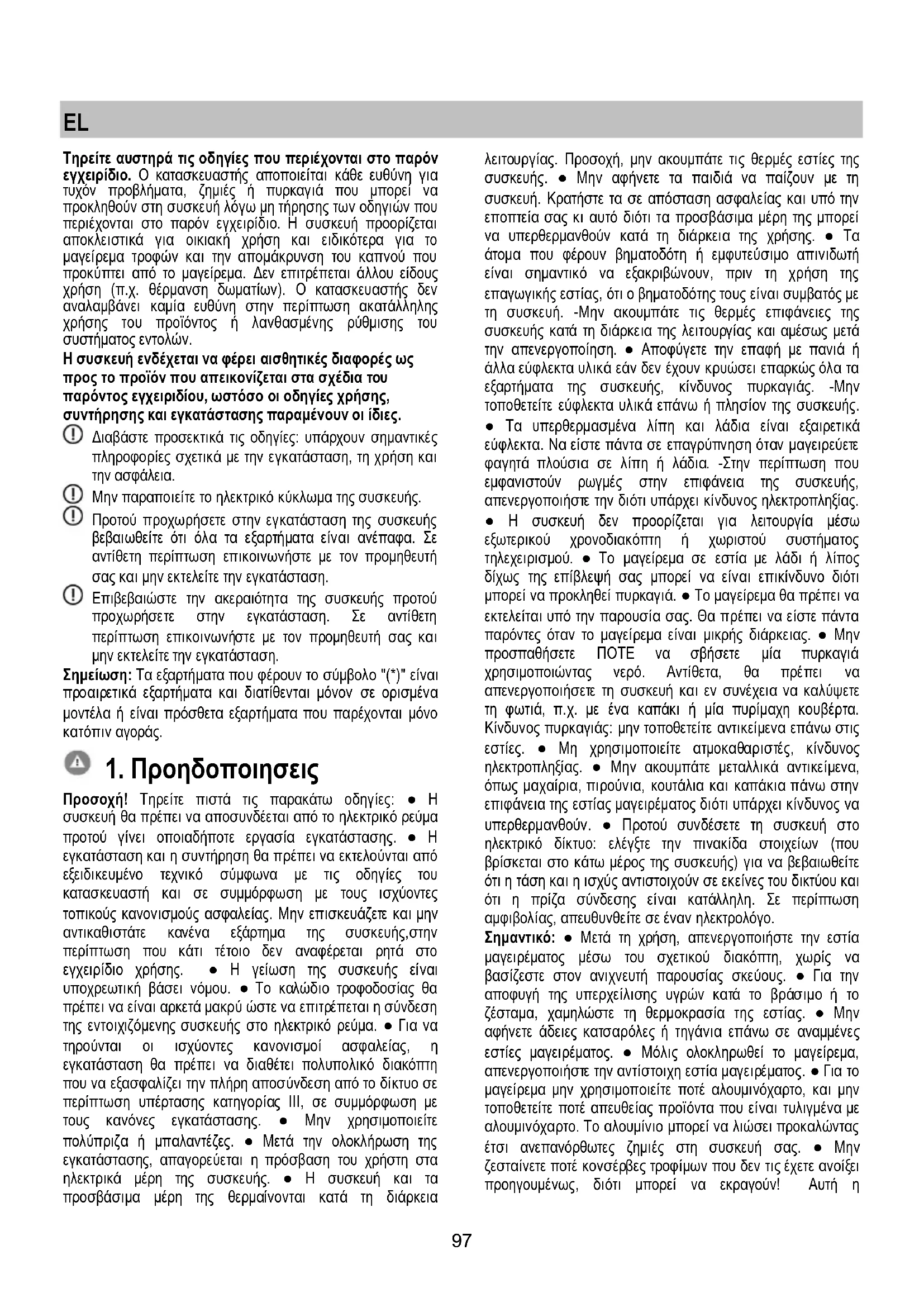 Τηρείτε αυστηρά τις οδηγίες που περιέχονται στο παρόν εγχειρίδιο. Ο κατασκευαστής αποποιείται κάθε ευθύνη για τυχόν προβλήματα, ζημιές ή πυρκαγιά που μπορεί να προκληθούν στη συσκευή λόγω μη τήρησης των οδηγιών που περιέχονται στο παρόν εγχειρίδιο. Η συσκευή προορίζεται αποκλειστικά για οικιακή χρήση και ειδικότερα για το μαγείρεμα τροφών και την απομάκρυνση του καπνού που προκύπτει από το μαγείρεμα. Δεν επιτρέπεται άλλου είδους χρήση (π.χ. θέρμανση δωματίων). Ο κατασκευαστής δεν αναλαμβάνει καμία ευθύνη στην περίπτωση ακατάλληλης χρήσης του προϊόντος ή λανθασμένης ρύθμισης του συστήματος εντολών. Η συσκευή ενδέχεται να φέρει αισθητικές διαφορές ως προς το προϊόν που απεικονίζεται στα σχέδια