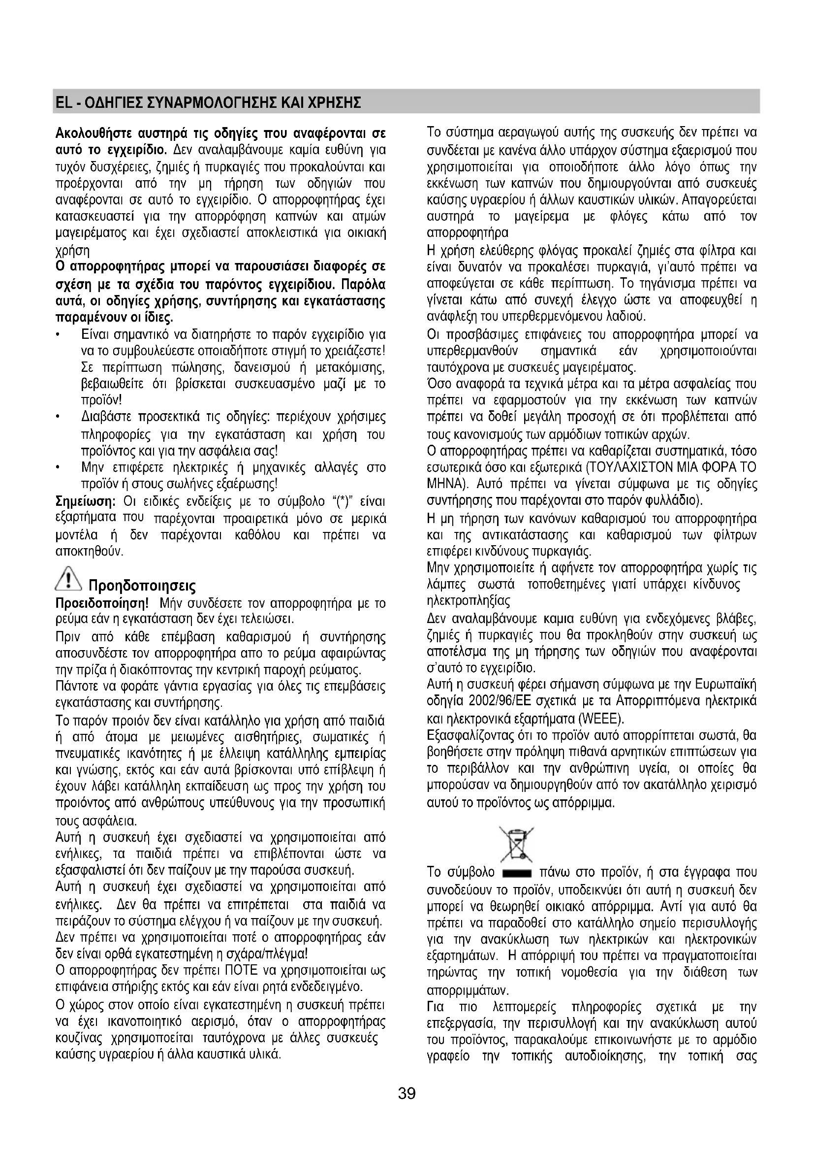 όσο και εξωτερικά (ΤΟΥΛΑΧΙΣΤΟΝ ΜΙΑ ΦΟΡΑ ΤΟ ΜΗΝΑ). Αυτό πρέπει να γίνεται σύμφωνα με τις οδηγίες συντήρησης που παρέχονται στο παρόν φυλλάδιο). Η μη τήρηση των κανόνων καθαρισμού του απορροφητήρα και της αντικατάστασης και καθαρισμού των φίλτρων επιφέρει κινδύνους πυρκαγιάς. Μην χρησιμοποιείτε ή αφήνετε τον απορροφητήρα χωρίς τις λάμπες σωστά τοποθετημένες γιατί υπάρχει κίνδυνος ηλεκτροπληξίας Δεν αναλαμβάνουμε καμια ευθύνη για ενδεχόμενες βλάβες, ζημιές ή πυρκαγιές που θα προκληθούν στην συσκευή ως αποτέλσμα της μη τήρησης των οδηγιών που αναφέρονται σ’αυτό το εγχειρίδιο. Αυτή η συσκευή φέρει σήμανση σύμφωνα με την Ευρωπαϊκή οδηγία 2002/96/ΕΕ σχετικά με τα Απορριπτόμενα ηλεκτρικά και ηλεκτρονικά εξαρτήματα (WEEE). Εξασφαλίζοντας ότι το προϊόν αυτό απορρίπτεται σωστά, θα βοηθήσετε στην πρόληψη πιθανά αρνητικών επιπτώσεων για το περιβάλλον και την ανθρώπινη υγεία, οι οποίες θα μπορούσαν να δημιουργηθούν από τον ακατάλληλο χειρισμό αυτού το προϊόντος ως απόρριμμα.