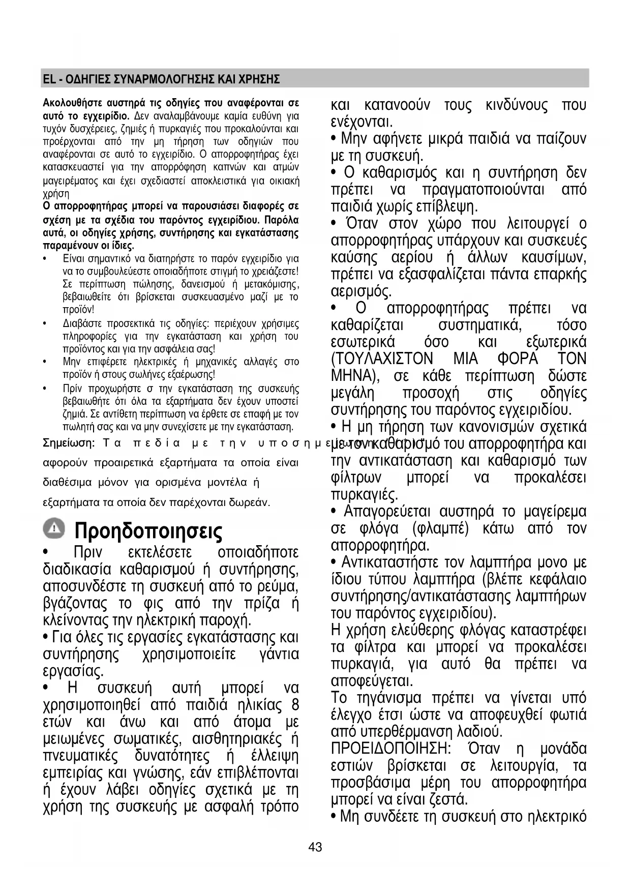 - Όταν στον χώρο που λειτουργεί ο απορροφητήρας υπάρχουν και συσκευές καύσης αερίου ή άλλων καυσίμων, πρέπει να εξασφαλίζεται πάντα επαρκής