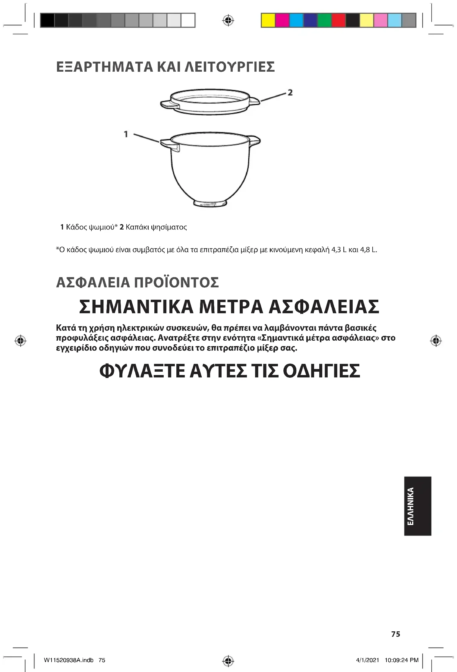 ΕΞΑΡΤΗΜΑΤΑ ΚΑΙ ΛΕΙΤΟΥΡΓΙΕΣ 1 Κάδος ψωμιού* 2 Καπάκι ψησίματος ΑΣΦΑΛΕΙΑ ΠΡΟΪΟΝΤΟΣ ΣΗΜΑΝΤΙΚΑ ΜΕΤΡΑ ΑΣΦΑΛΕΙΑΣ Κατά τη χρήση ηλεκτρικών συσκευών, θα πρέπει να λαμβάνονται πάντα βασικές προφυλάξεις ασφάλειας. Ανατρέξτε στην ενότητα «Σημαντικά μέτρα ασφάλειας» στο εγχειρίδιο οδηγιών που συνοδεύει το επιτραπέζιο μίξερ σας. ΦΥΛΑΞΤΕ ΑΥΤΕΣ ΤΙΣ ΟΔΗΓΙΕΣ