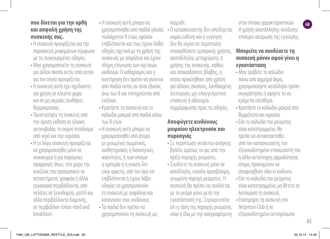 - Η εν λόγω συσκευή προορίζεται να χρησιμοποιηθεί μόνο σε νοικοκυριά ή για παρόμοιες εφαρμογές όπως: στο χώρο της κουζίνας του προσωπικού σε καταστήματα, γραφεία ή άλλα εργασιακά περιβάλλοντα, από πελάτες σε ξενοδοχεία, μοτέλ και άλλα περιβάλλοντα διαμονής, σε περιβάλλον τύπου «bed and breakfast». 7484_UM_LATTISSIMA_RESTYLE_Z2A.indb 65